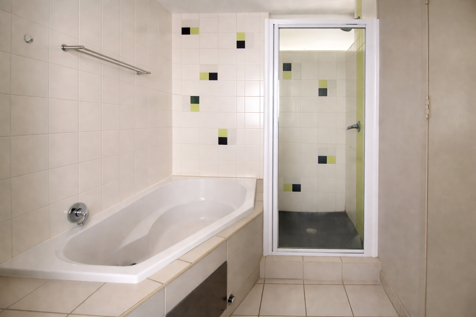 The bathroom features both a bathtub and a separate shower.