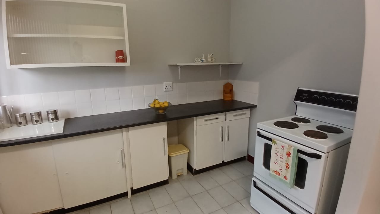 Security is addressed with an access gate and security bars on all windows, providing peace of mind. The robust construction further contributes to a secure and stable living space. While the kitchen maintains a functional layout, it offers a solid foundation for future personalization, allowing tenants to infuse their own style.