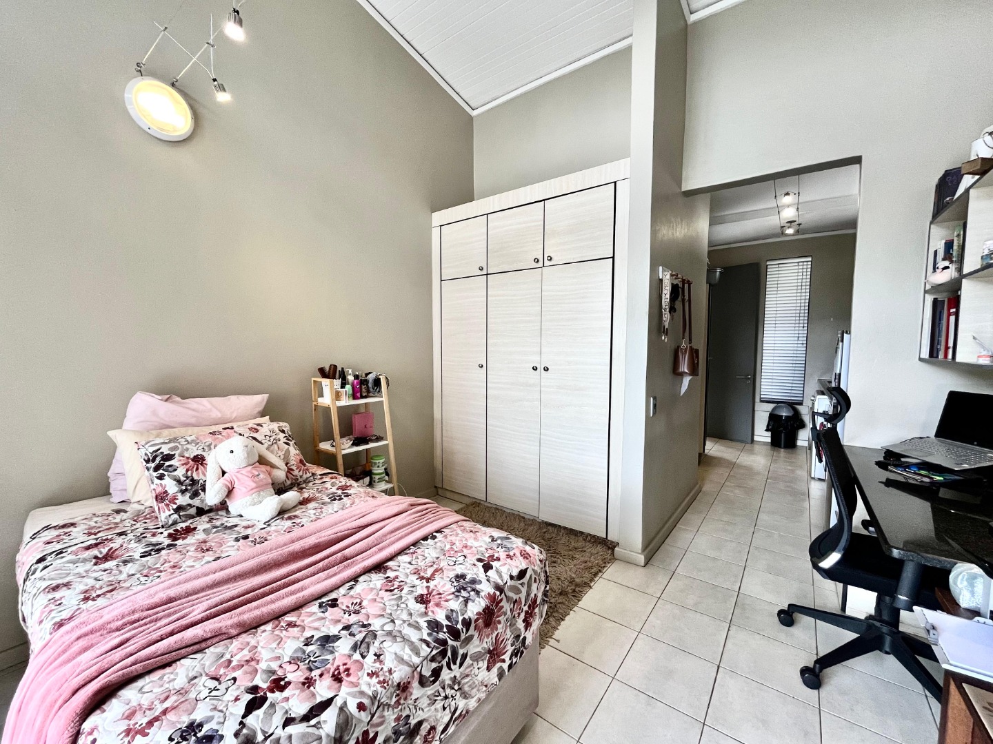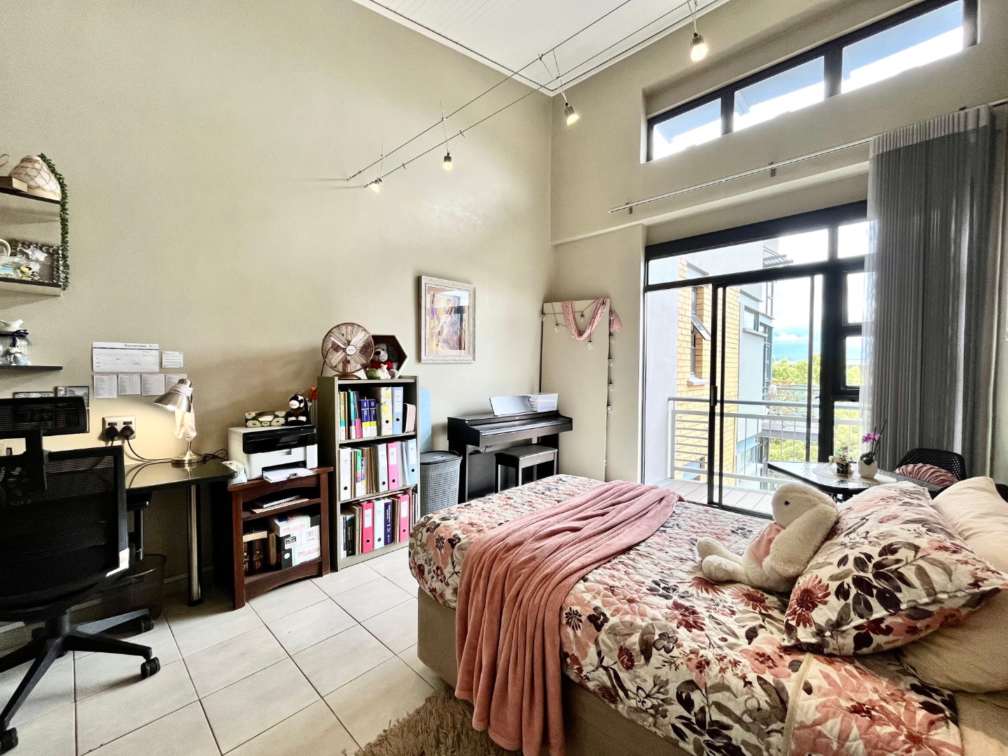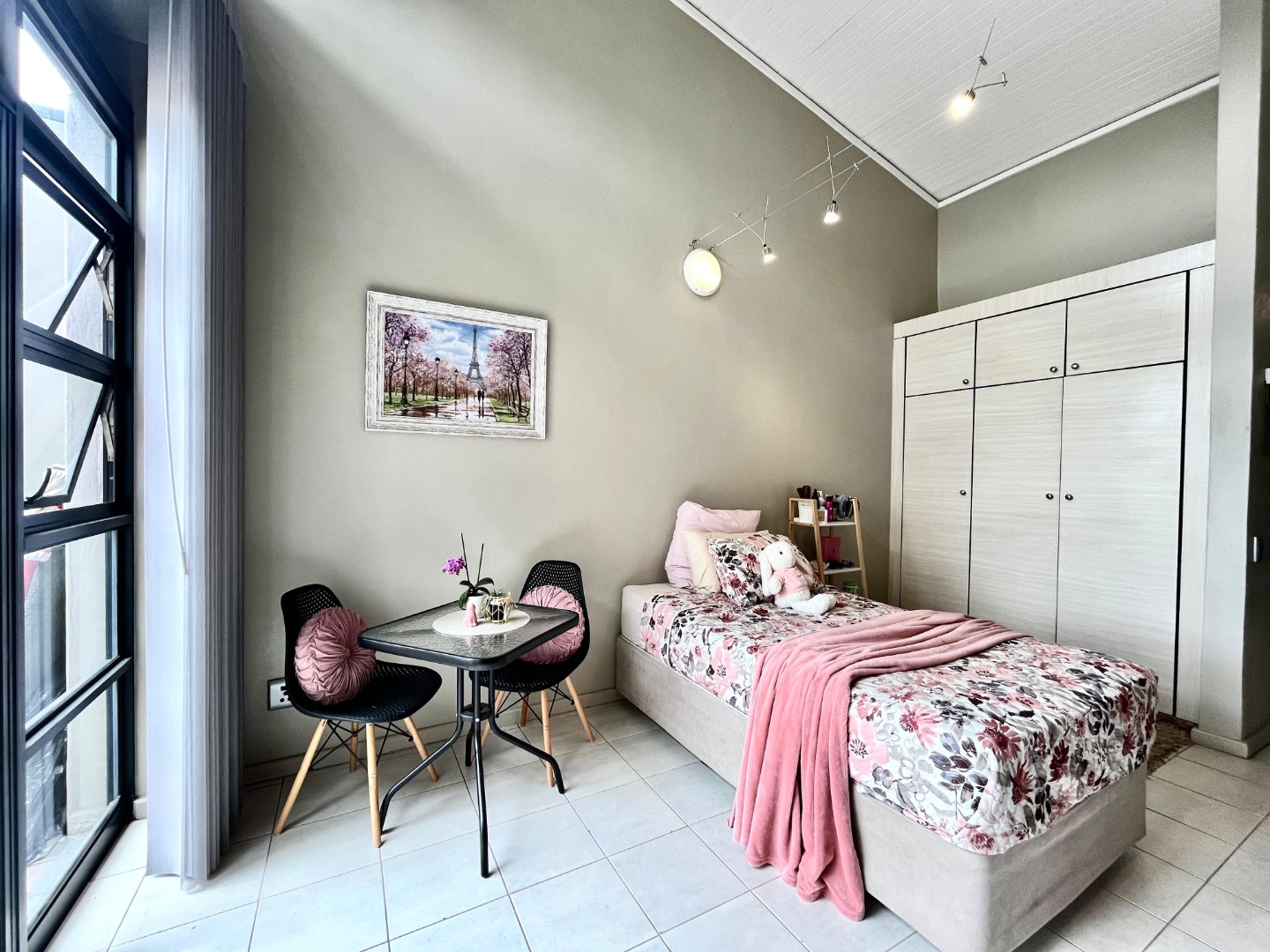 This modern, semi furnished studio apartment in Lynnwood offers a compact yet highly functional living space. The open-plan layout features a well-equipped kitchen with appliances, including a washing machine, oven, stove, fridge/freezer, and microwave, alongside stylish light wood-grain cabinetry. High, vaulted ceilings, track lighting, a built-in wardrobe, and a dedicated workspace enhance convenience. A private balcony provides fresh air and city views.