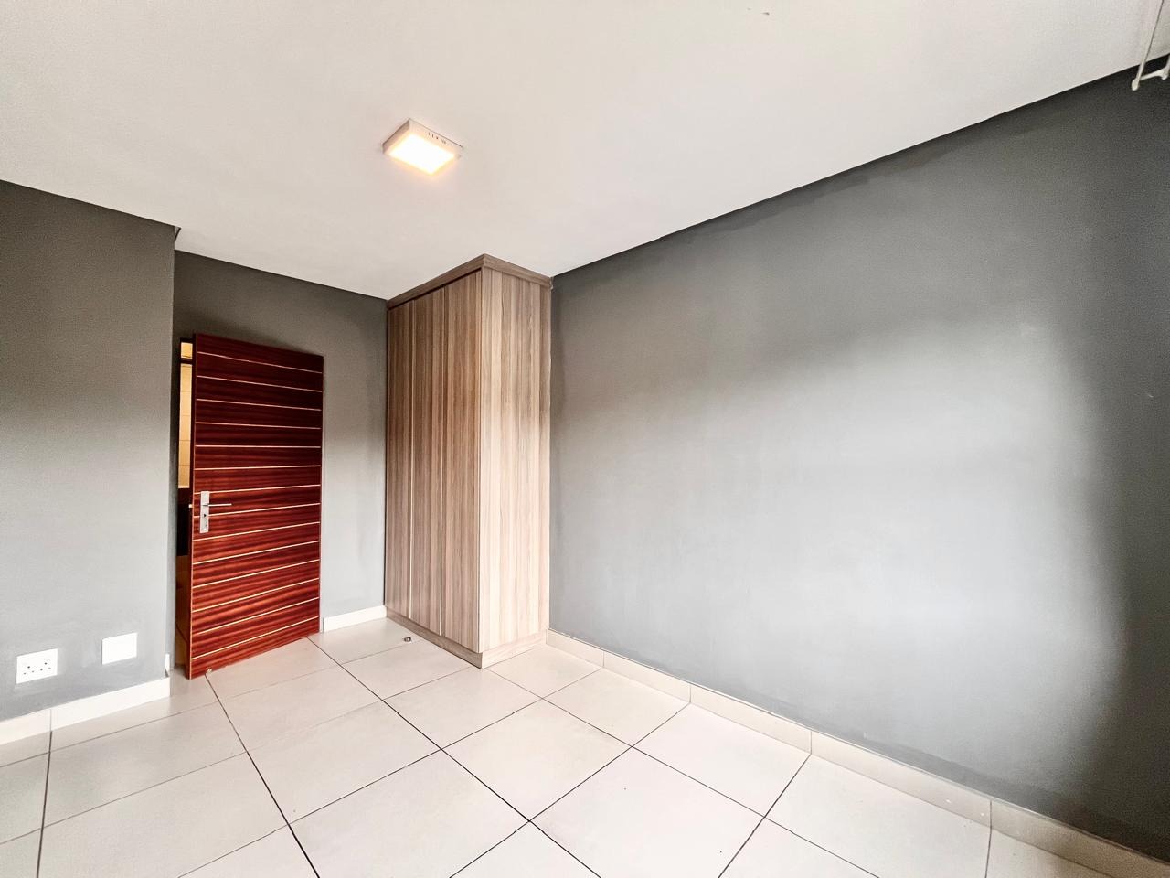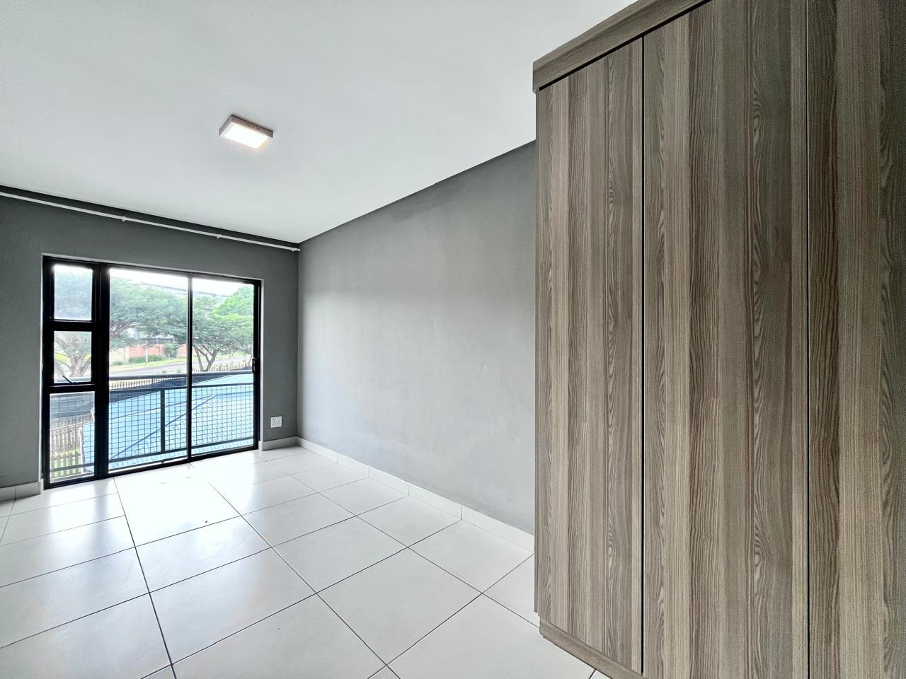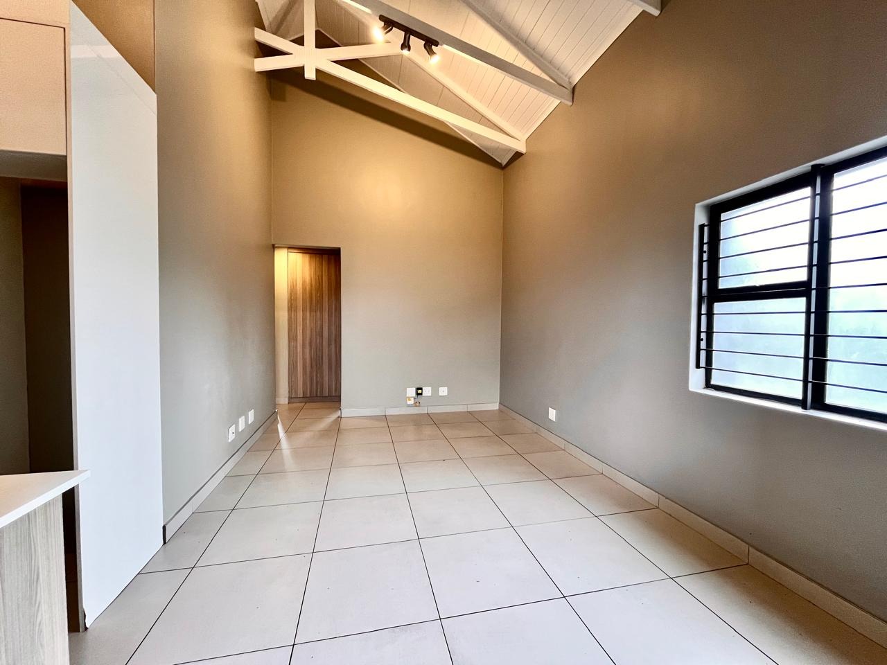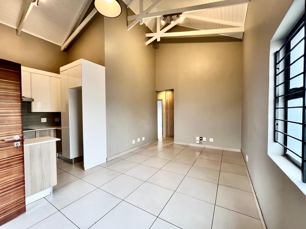 This contemporary 2-bedroom, 1-bathroom residence offers sophisticated living within a secure complex in Menlo Park, Pretoria. The open-plan design features high vaulted ceilings with exposed trusses, enhancing space and light. A modern kitchen, equipped with stylish two-tone cabinetry and integrated appliances, seamlessly flows into the lounge. Both bedrooms include built-in wardrobes and receive ample natural light. The sleek bathroom boasts contemporary fixtures and a glass-enclosed shower. Ideal for professionals or small families, this unfurnished unit provides a versatile canvas. Residents benefit from electric fencing, fibre connectivity, two dedicated parking bays, and a communal braai area. The location offers convenient access to local amenities and transport routes.