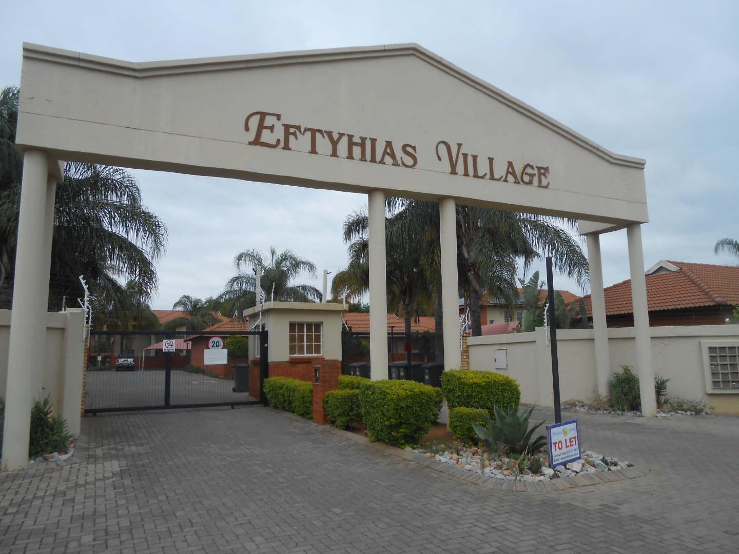 Security is a paramount feature of this residential community. The complex boasts a grand, arched entrance with controlled access via a security gate , ensuring peace of mind for all residents. High perimeter walls are topped with electric fencing, further enhancing the secure environment. Well-maintained landscaping and paved driveways contribute to the appealing aesthetic of the village.
