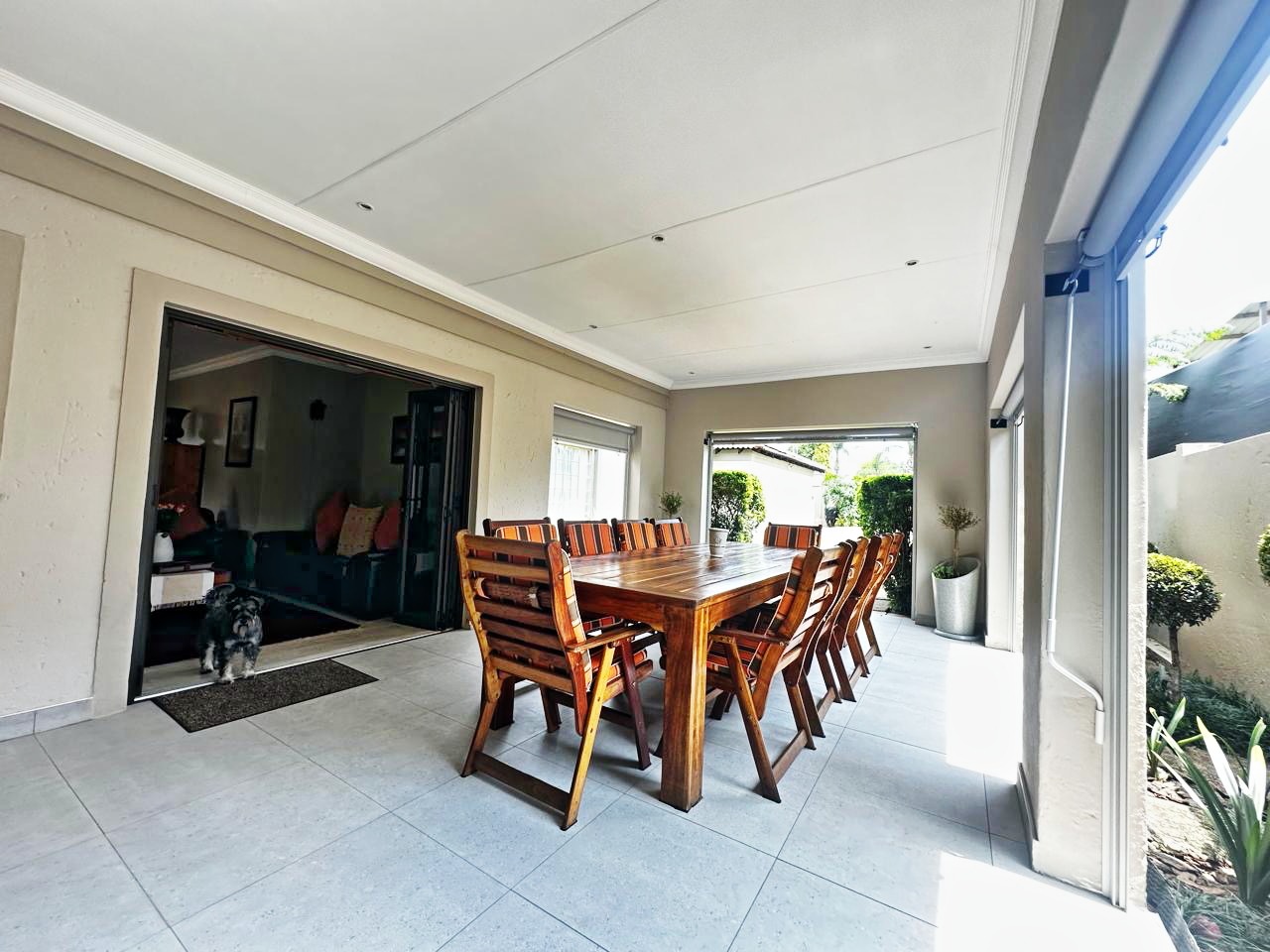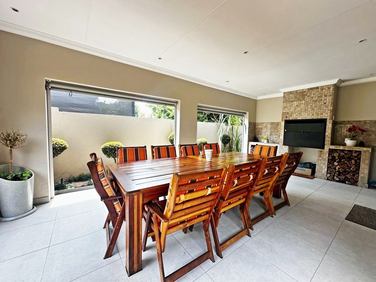 Step outside to enjoy the enclosed patio with a built-in braai, overlooking a heated swimming pool and a beautifully maintained garden, perfect for relaxing weekends with family and friends.