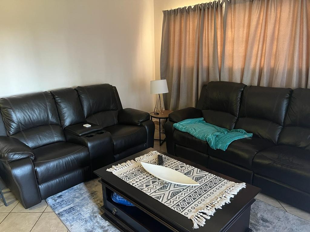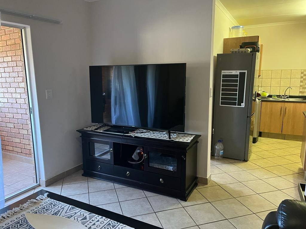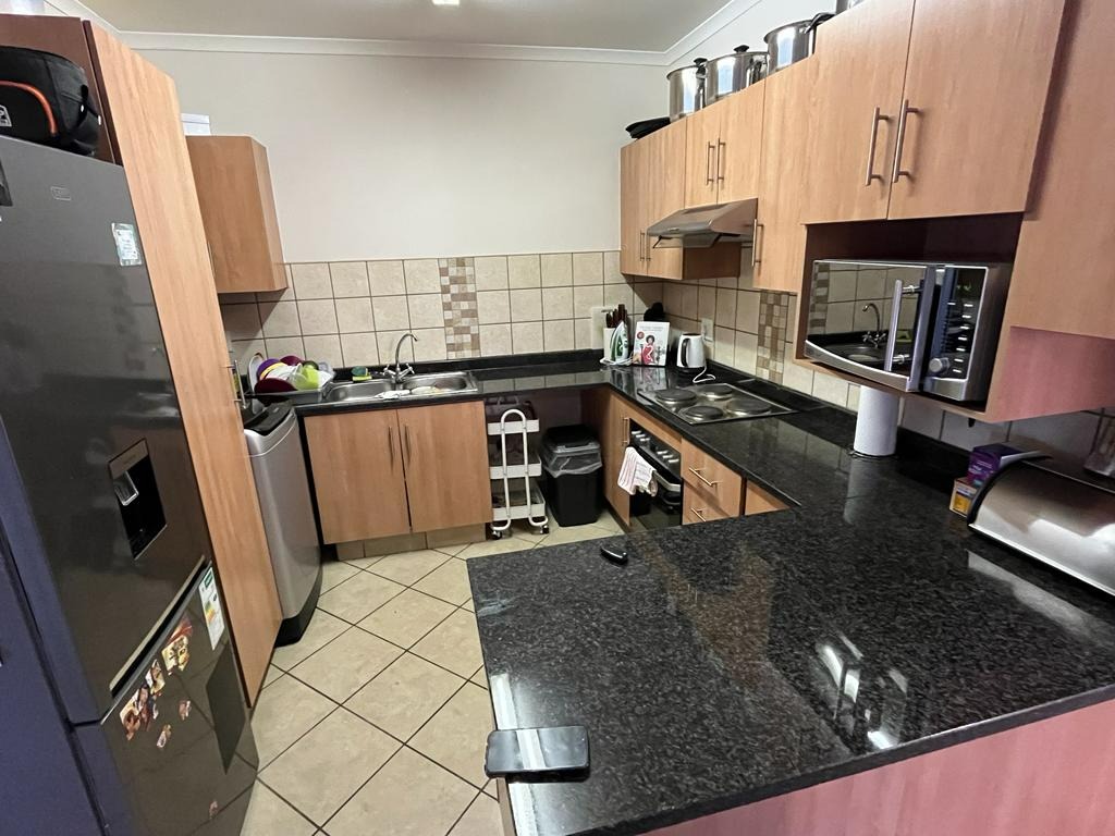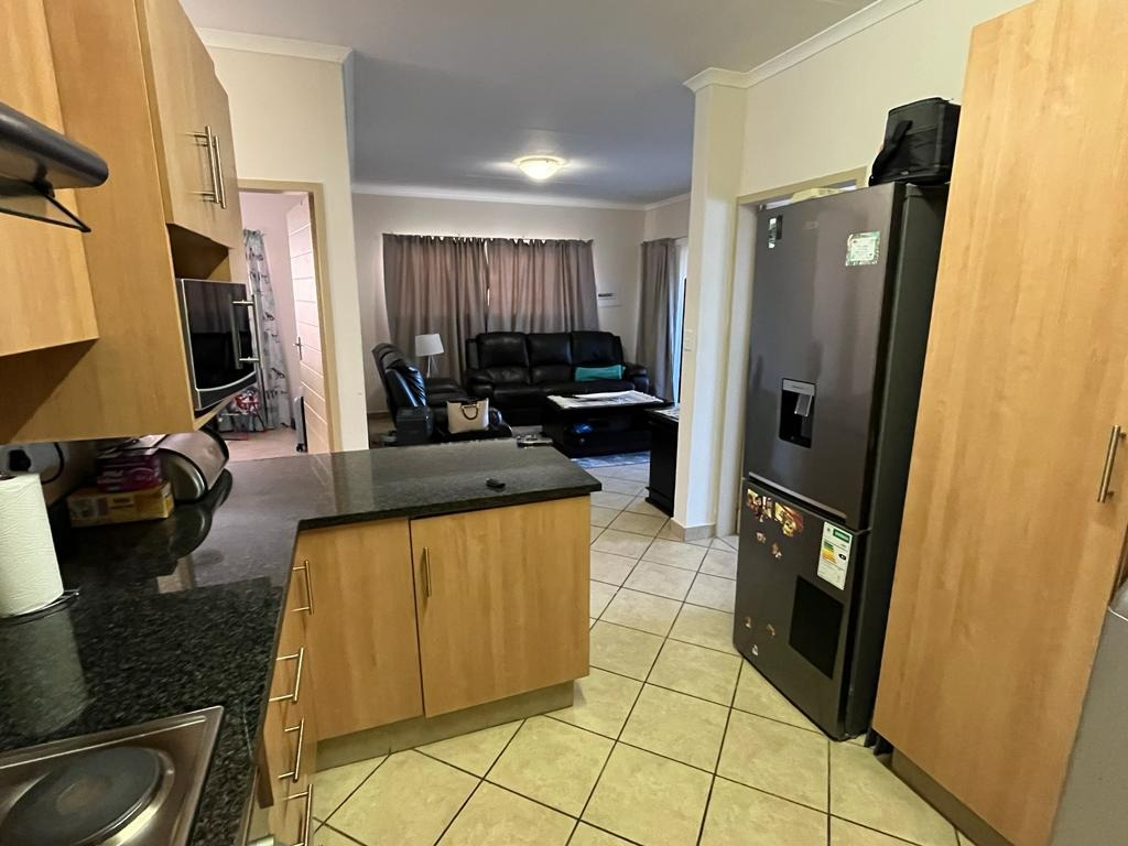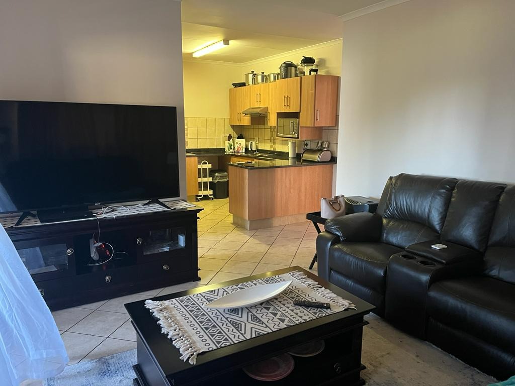 Comfortable living in this 2-bedroom, 1-bathroom property, situated in a secure complex. This property features an inviting open-plan layout, seamlessly connecting the living area and kitchen. The kitchen is equipped with modern light wood cabinetry, dark countertops, a tiled backsplash, and includes a convenient pantry, catering to all your culinary needs.