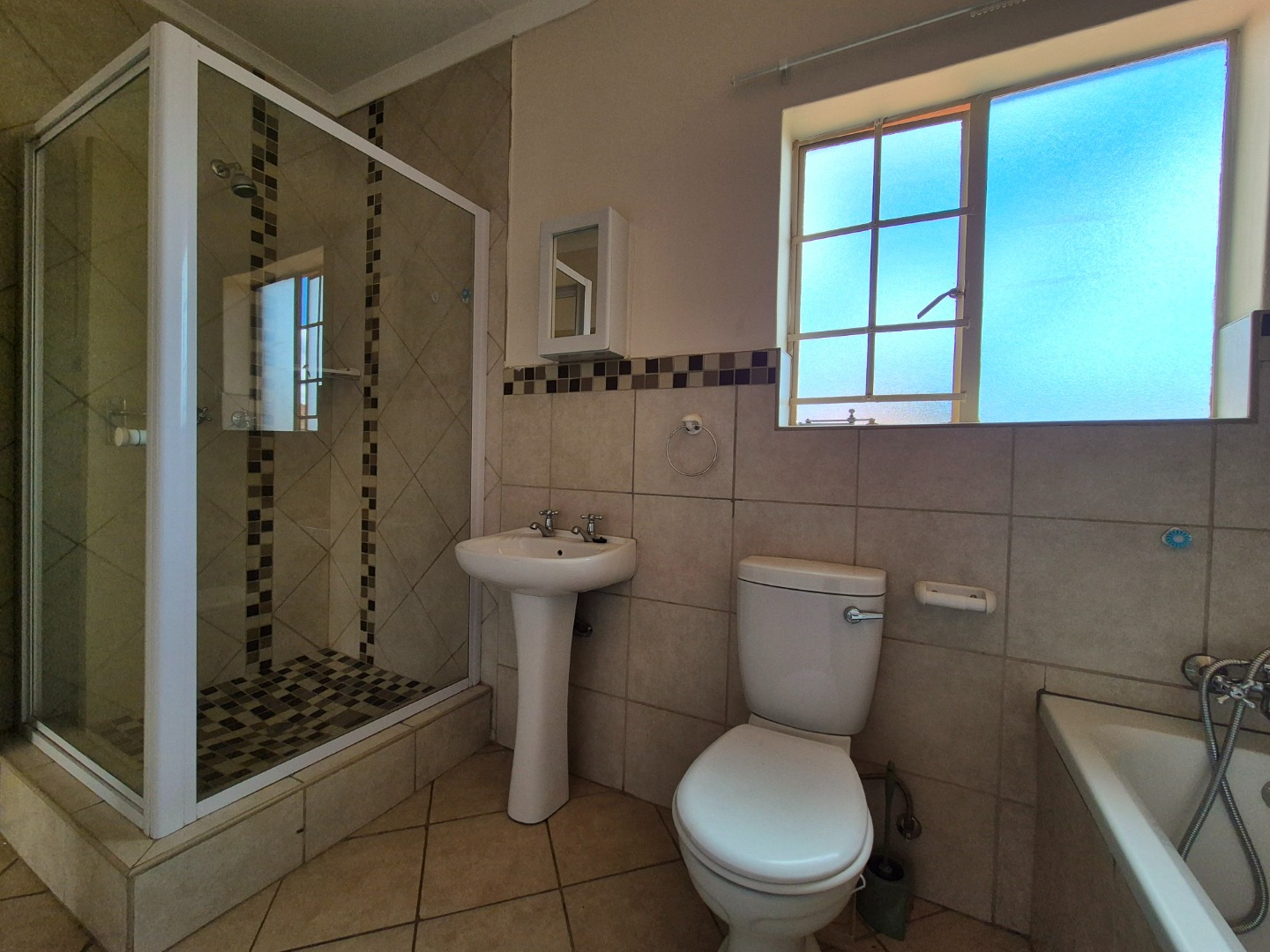 The two bedrooms offer practical living spaces, each featuring tiled floors and built-in wardrobes for ample storage. The single bathroom is functional, boasting both a bathtub and a separate glass-enclosed shower, along with tiled walls and flooring. Natural light fills the rooms, enhancing the welcoming atmosphere. Enclosed braai area for relaxation and all year round braai encounters.