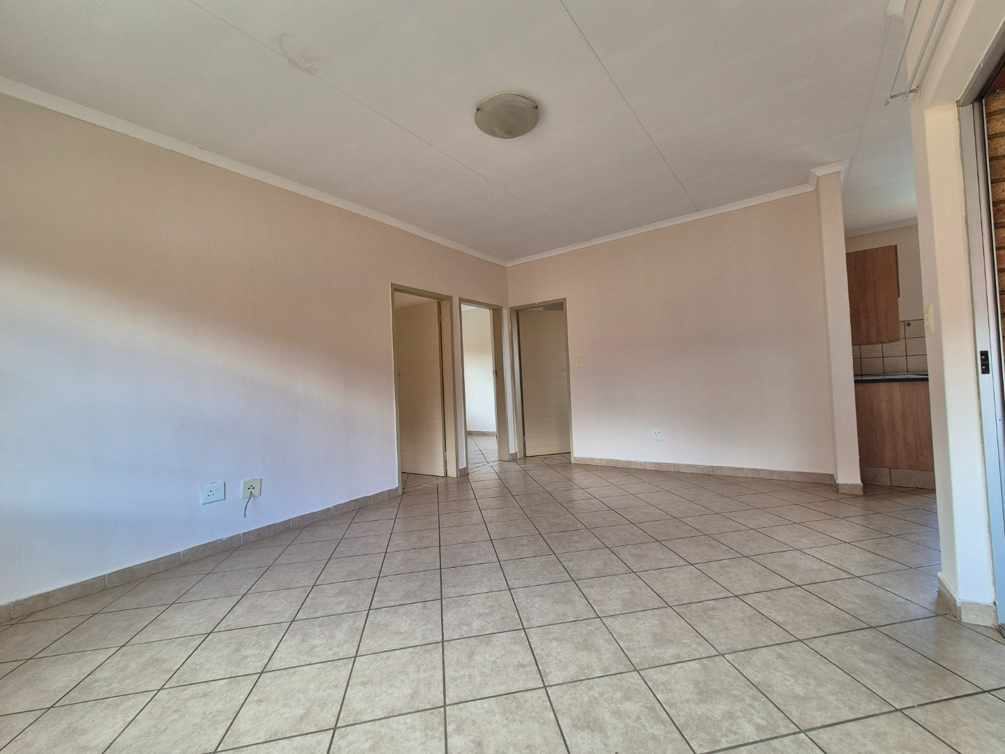 Comfortable living in this 2-bedroom, 1-bathroom property, situated in a secure complex. This property features an inviting open-plan layout, seamlessly connecting the living area and kitchen. The kitchen is equipped with modern light wood cabinetry, dark countertops, a tiled backsplash, and includes a convenient pantry, catering to all your culinary needs.