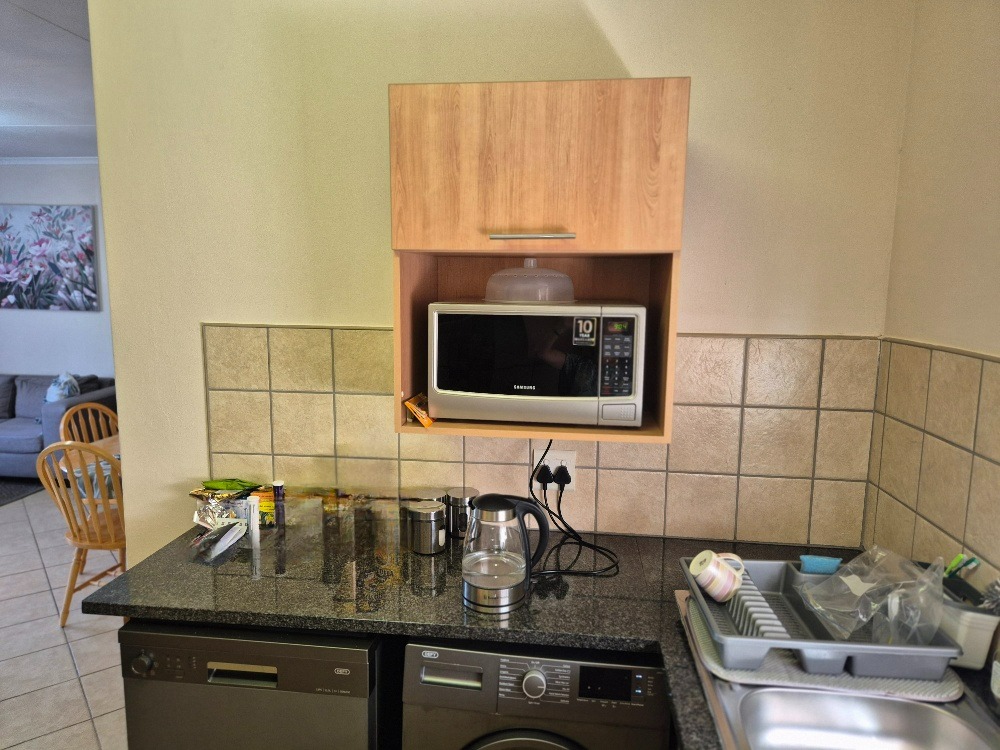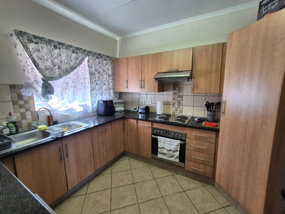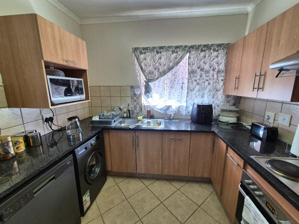 Discover comfortable living in this modern 2-bedroom, 1-bathroom rental unit, spanning 98 square metres, located within a secure complex in Olympus AH, Pretoria. The open-plan design seamlessly connects the living areas, featuring durable tiled flooring and neutral wall colours for a versatile aesthetic. The functional kitchen boasts light wooden cabinetry, granite countertops, and is well-equipped with an integrated oven, hob, extractor fan, and a double sink. The convenience of integrated washing machine and dishwasher connections, enhancing daily functionality.