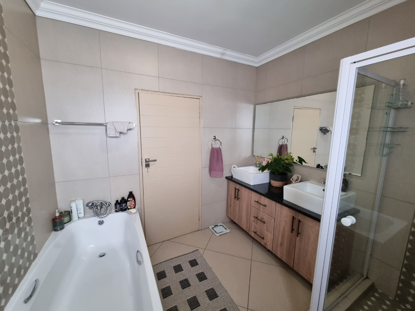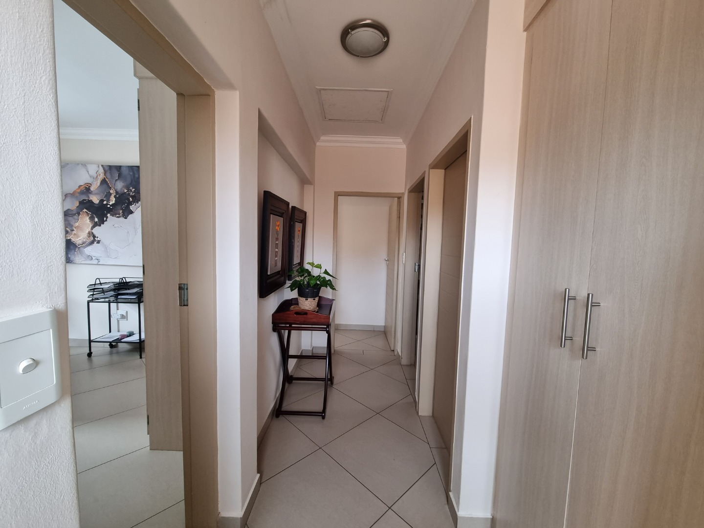 Outdoor living is equally appealing with a private balcony and patio, ideal for relaxation or entertaining. Enjoy al fresco dining with the convenience of a built-in braai, overlooking a manageable garden. The property also includes two garages and an additional parking space, ensuring ample parking for residents and guests. Practical features such as paving and sliding doors enhance the home's functionality and aesthetic.