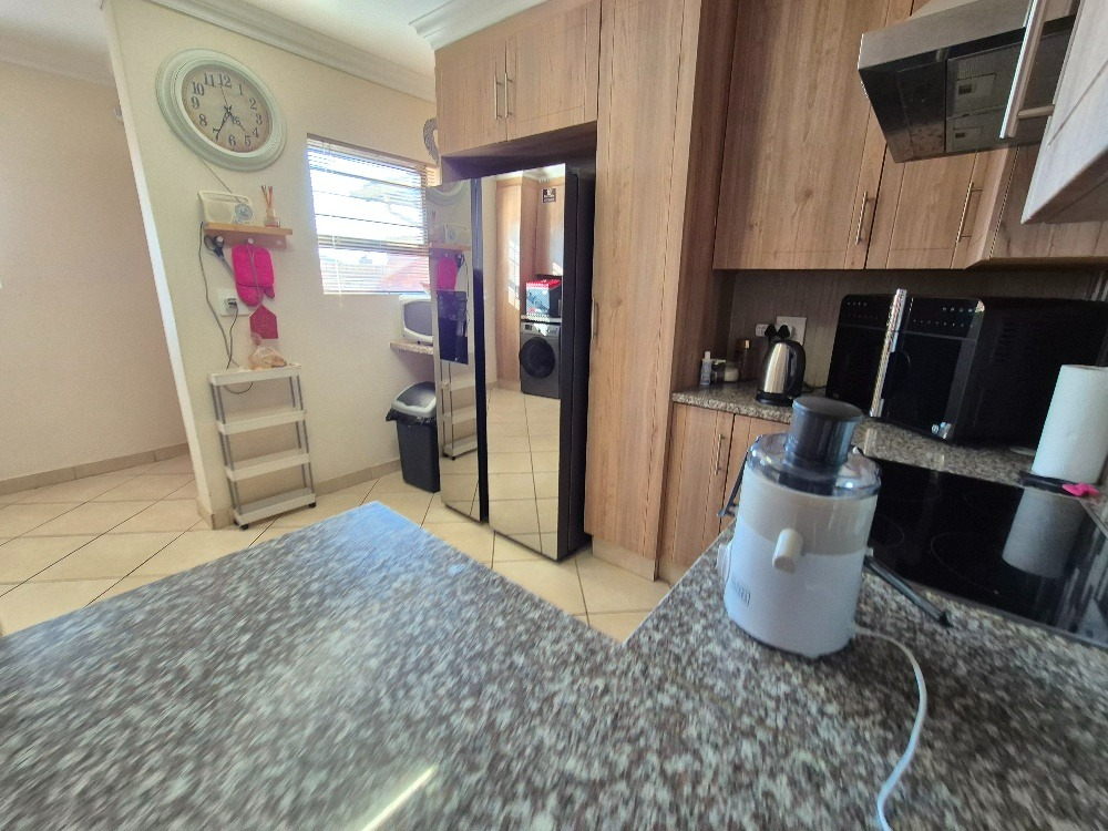 Step outside to a private patio featuring a built-in braai, perfect for outdoor dining and entertaining, overlooking a manageable garden. The property is equipped with comprehensive security features, including 24-hour security, electric fencing, an access gate, a security post, burglar bars, and a security gate, ensuring a safe environment. Further conveniences include two dedicated garages and fibre connectivity, catering to modern lifestyle needs.