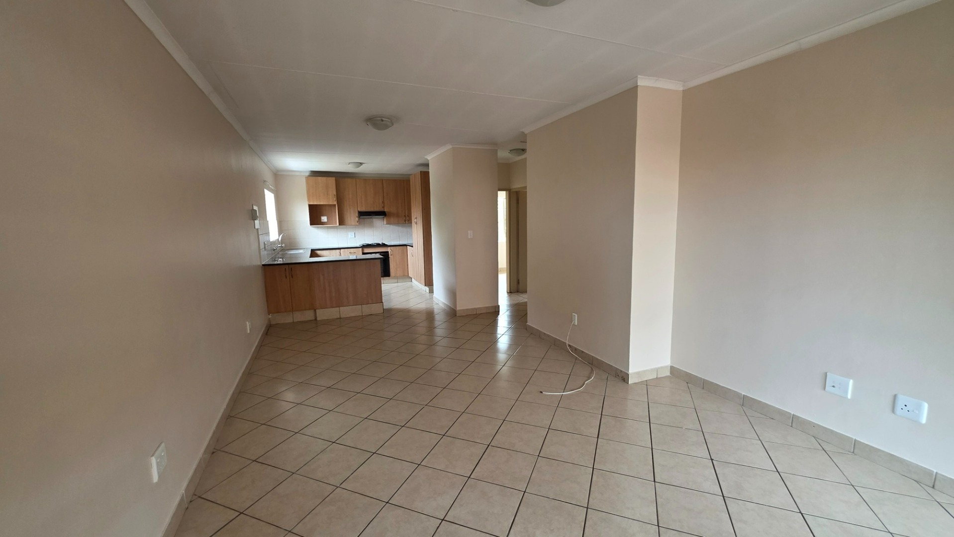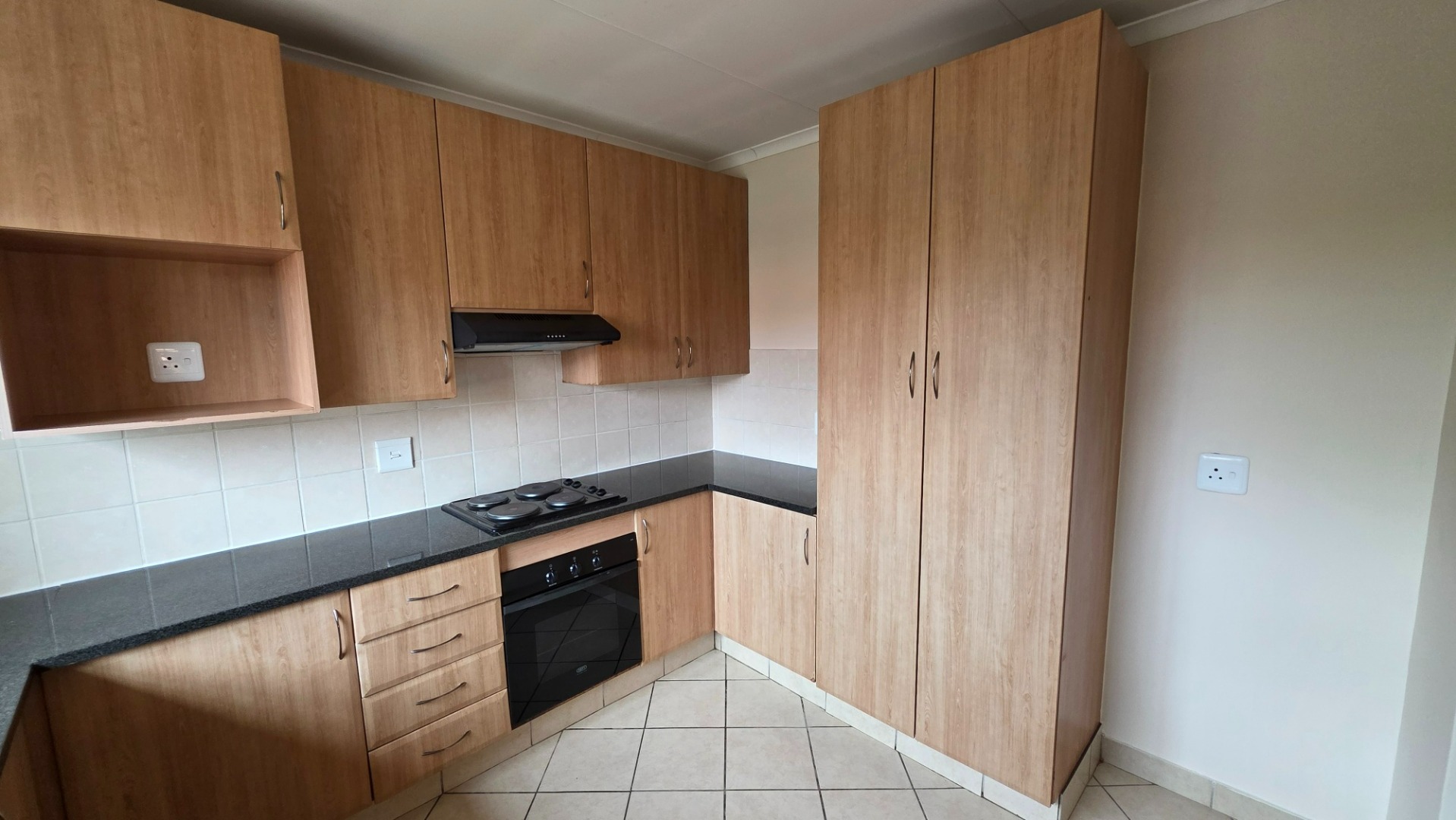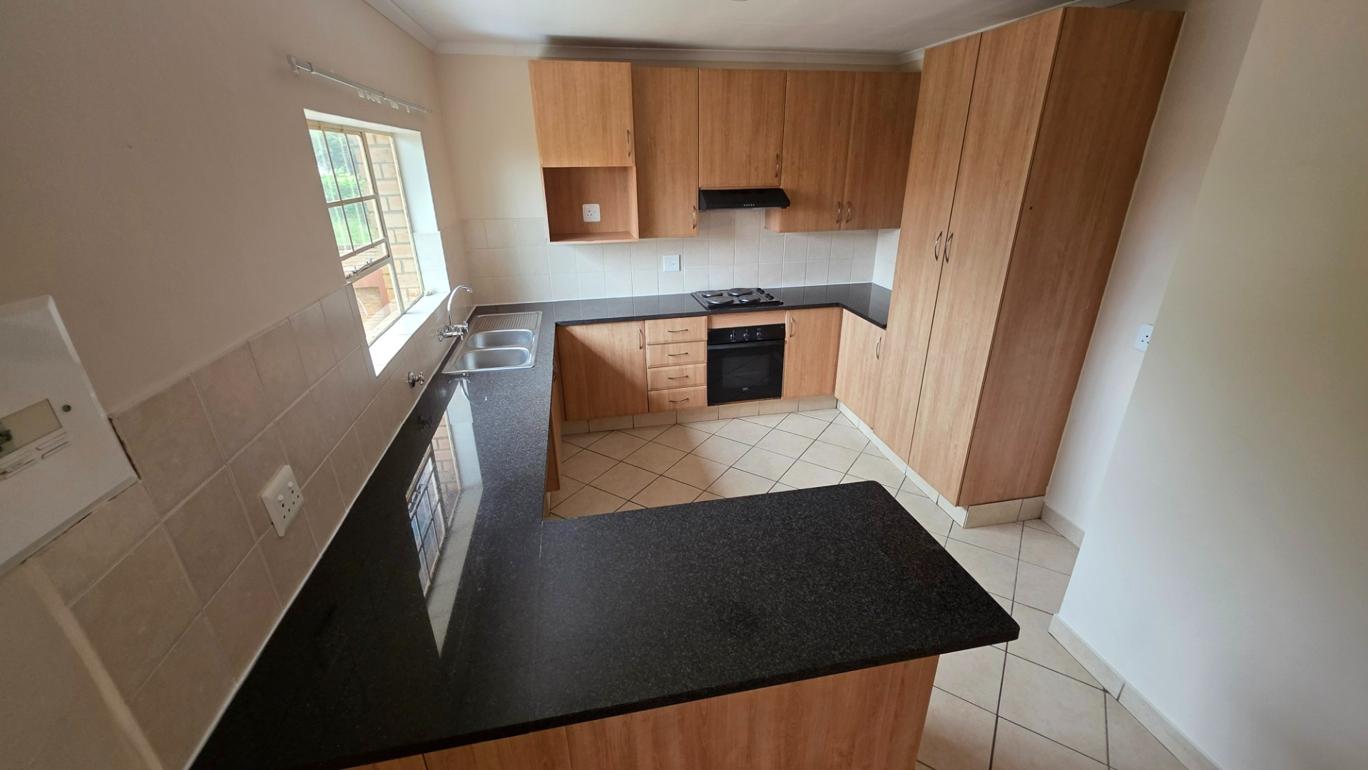 This inviting 2-bedroom, 2-bathroom apartment, including one ensuite, offers a comfortable and secure living experience within a well-maintained residential development in Silver Lakes, Pretoria. Spanning 123 square meters, the residence features a practical open-plan layout that seamlessly connects the living area with a modern kitchen. The kitchen is well-appointed with light wood cabinetry, dark granite-look countertops, a built-in oven and hob, a double sink, and ample storage, including a pantry. Tiled flooring and neutral walls throughout create a clean, versatile canvas ready for personal touches.