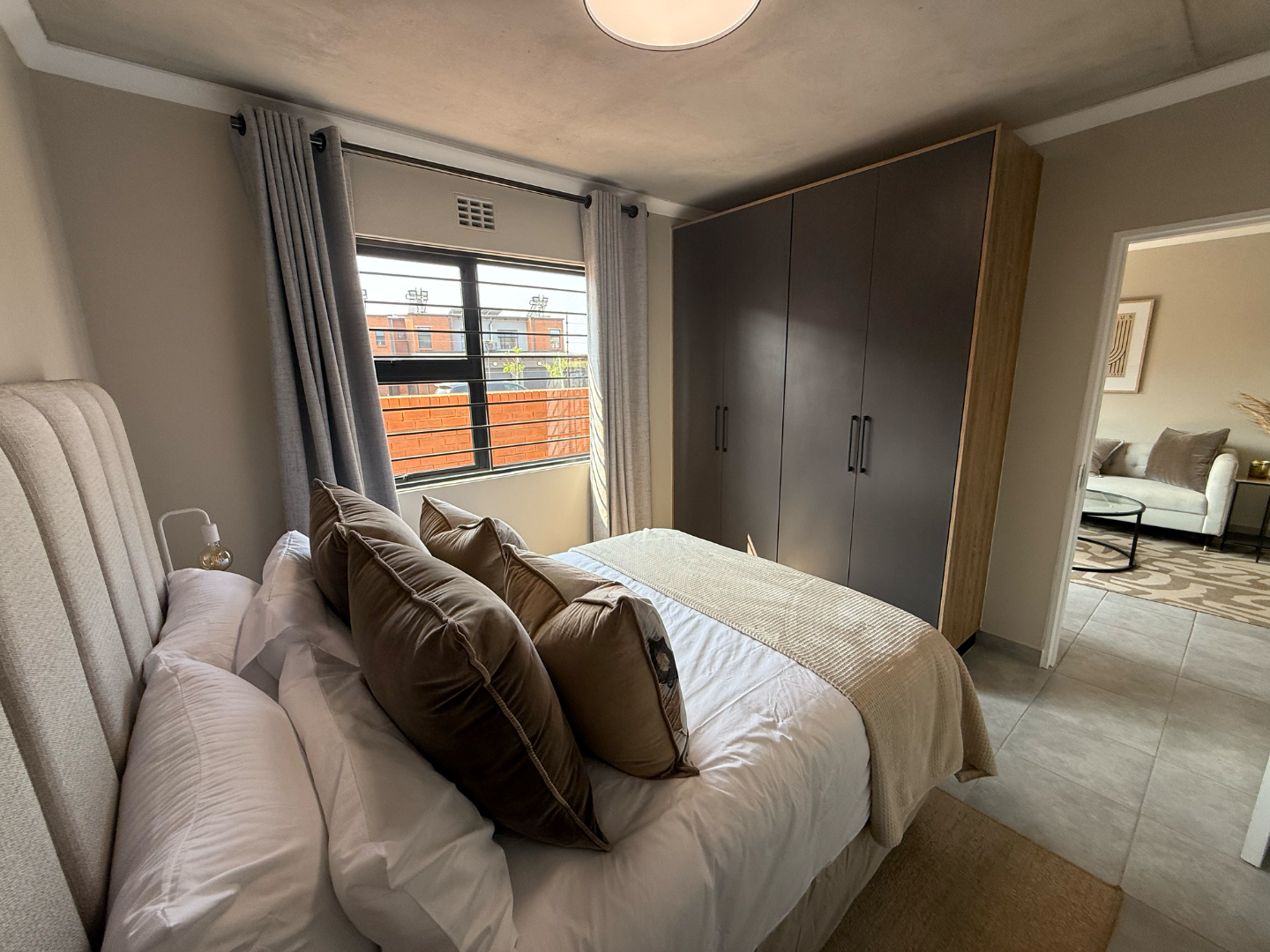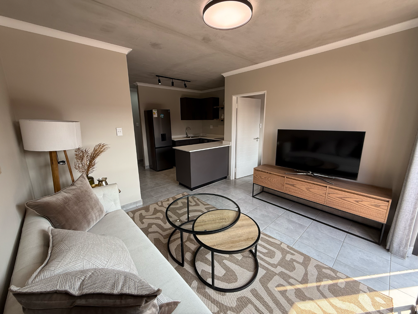 Discover modern living in this stylish 2 bedroom, 2 bathroom apartment available for rent in a secure complex in Sinoville, Pretoria North . Spanning 88 square metres, this residence offers a contemporary open plan layout, seamlessly connecting the living area with a well appointed kitchen. The kitchen features a functional breakfast bar, ideal for casual dining, complemented by sleek finishes and durable tiled flooring throughout the apartment. Natural light floods the space, enhancing the minimalist aesthetic, which includes an exposed concrete ceiling as a unique design element. The property also includes a dedicated lounge, perfect for relaxation or as a family TV room, with sliding doors providing convenient access to a outdoor space.