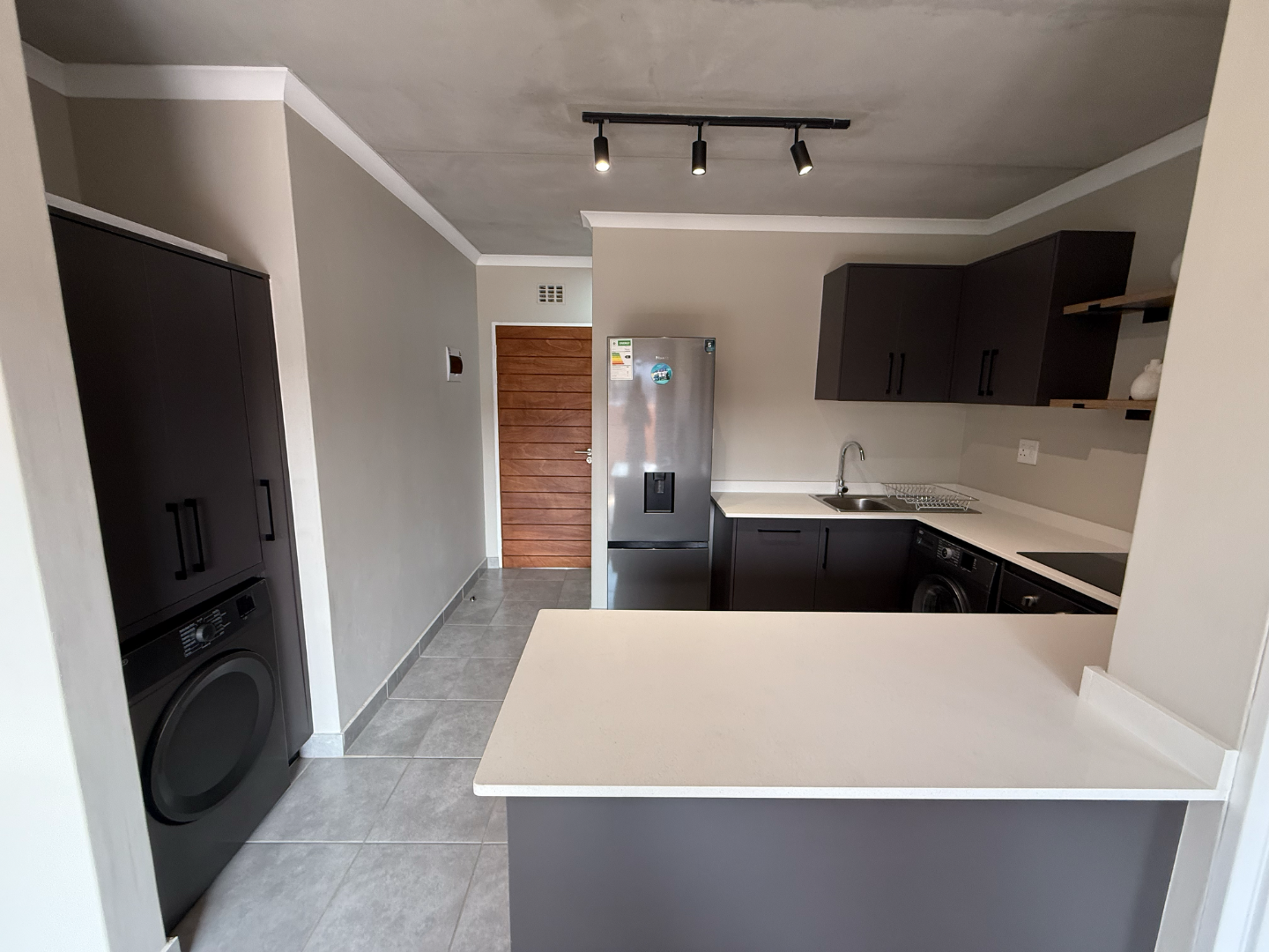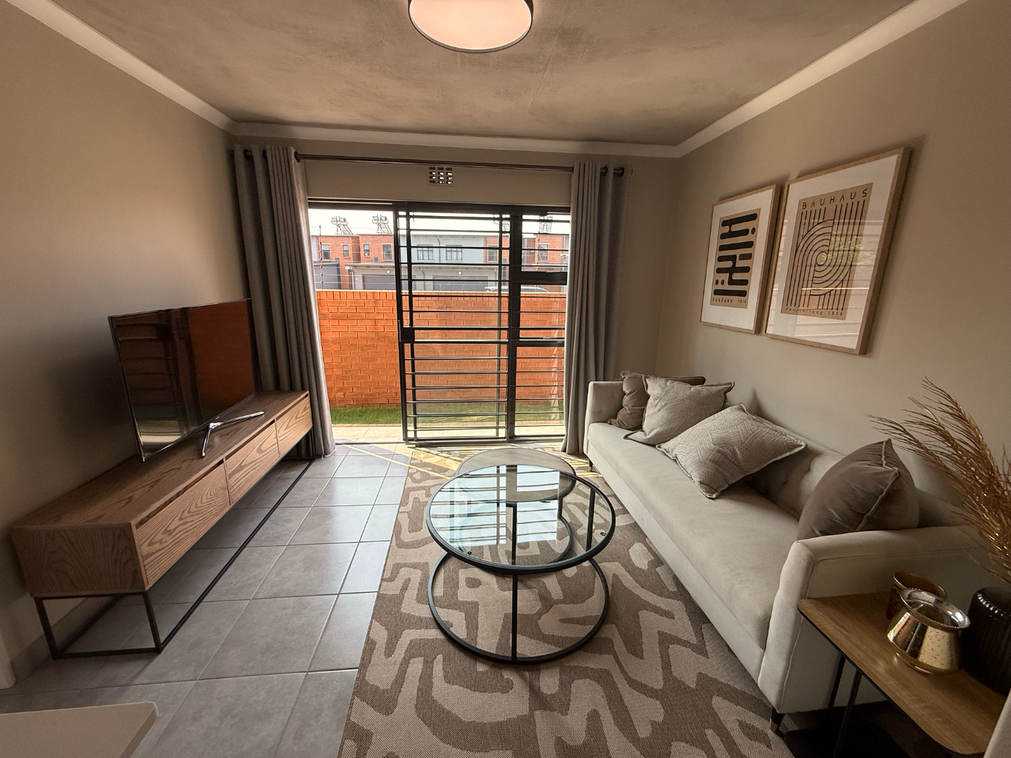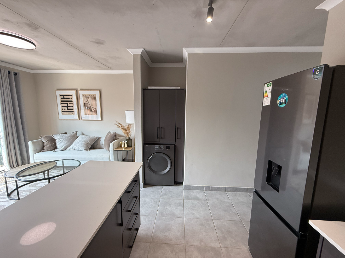 Discover modern living in this stylish 2 bedroom, 2 bathroom apartment available for rent in a secure complex in Sinoville, Pretoria North . Spanning 88 square metres, this residence offers a contemporary open plan layout, seamlessly connecting the living area with a well appointed kitchen. The kitchen features a functional breakfast bar, ideal for casual dining, complemented by sleek finishes and durable tiled flooring throughout the apartment. Natural light floods the space, enhancing the minimalist aesthetic, which includes an exposed concrete ceiling as a unique design element. The property also includes a dedicated lounge, perfect for relaxation or as a family TV room, with sliding doors providing convenient access to a outdoor space.
