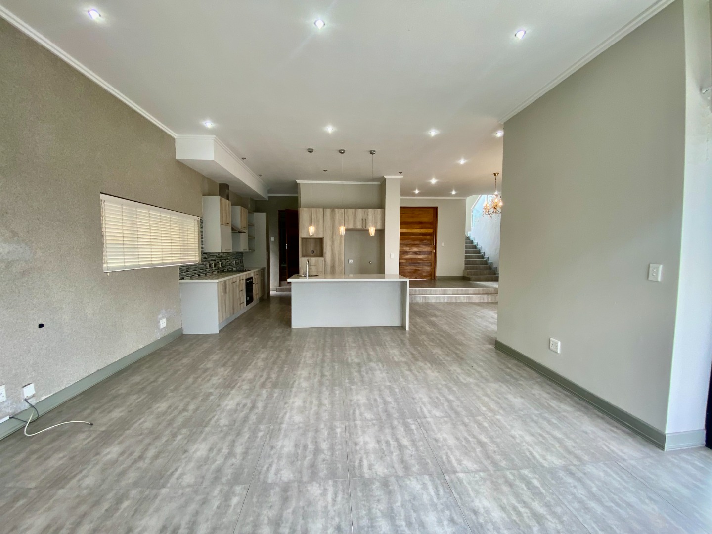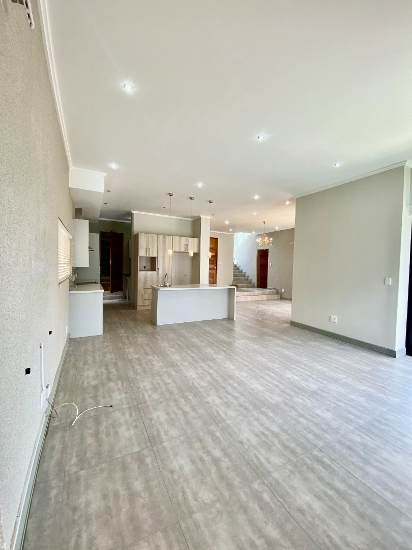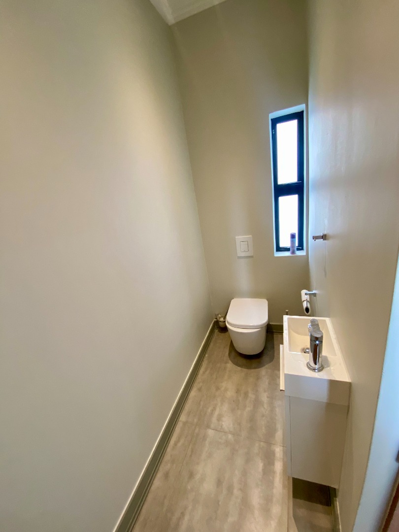 As you step through the main entrance, you are welcomed into a stunning open-plan living area. To your left, a stylish guest bathroom with a toilet and basin provides convenience for visitors. The space seamlessly flows into the lounge, dining area, and kitchen and scullery each defined by beautiful finishes, designer wall features, and exquisite flooring that enhance the home's contemporary aesthetic.