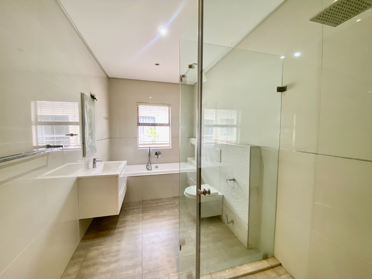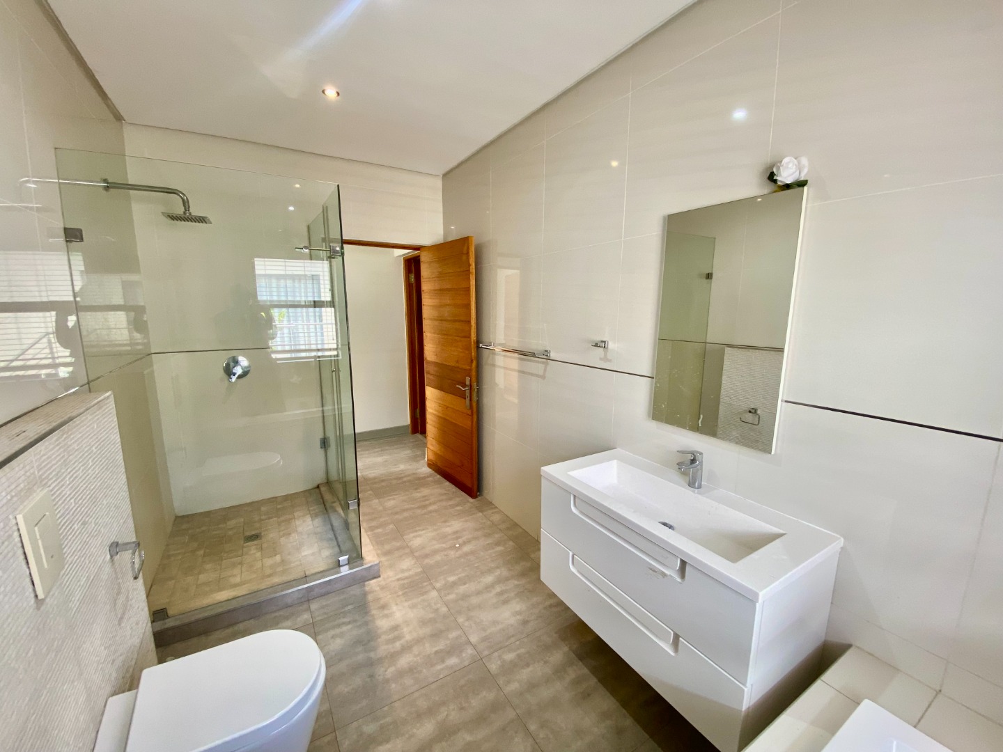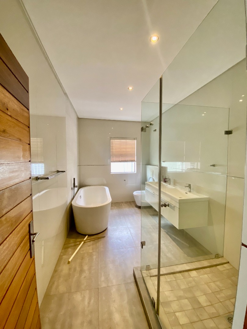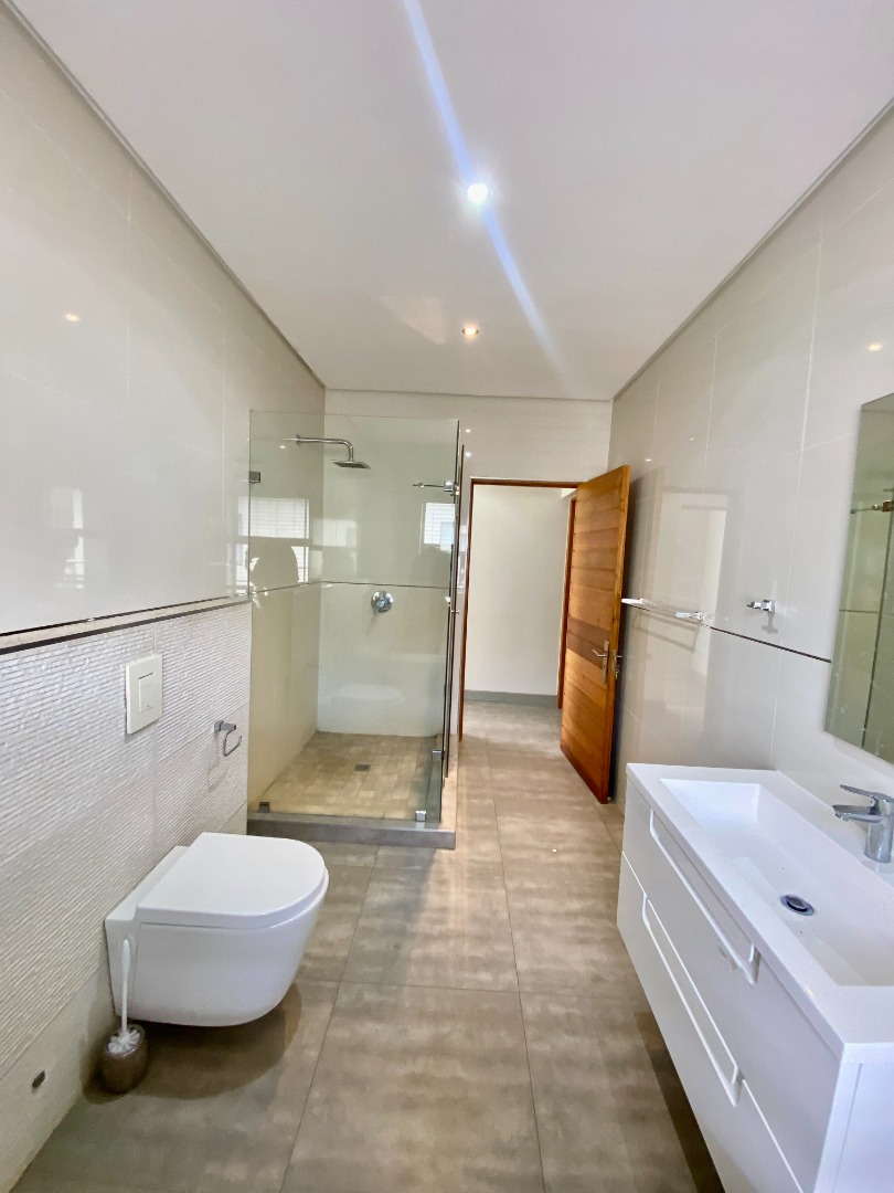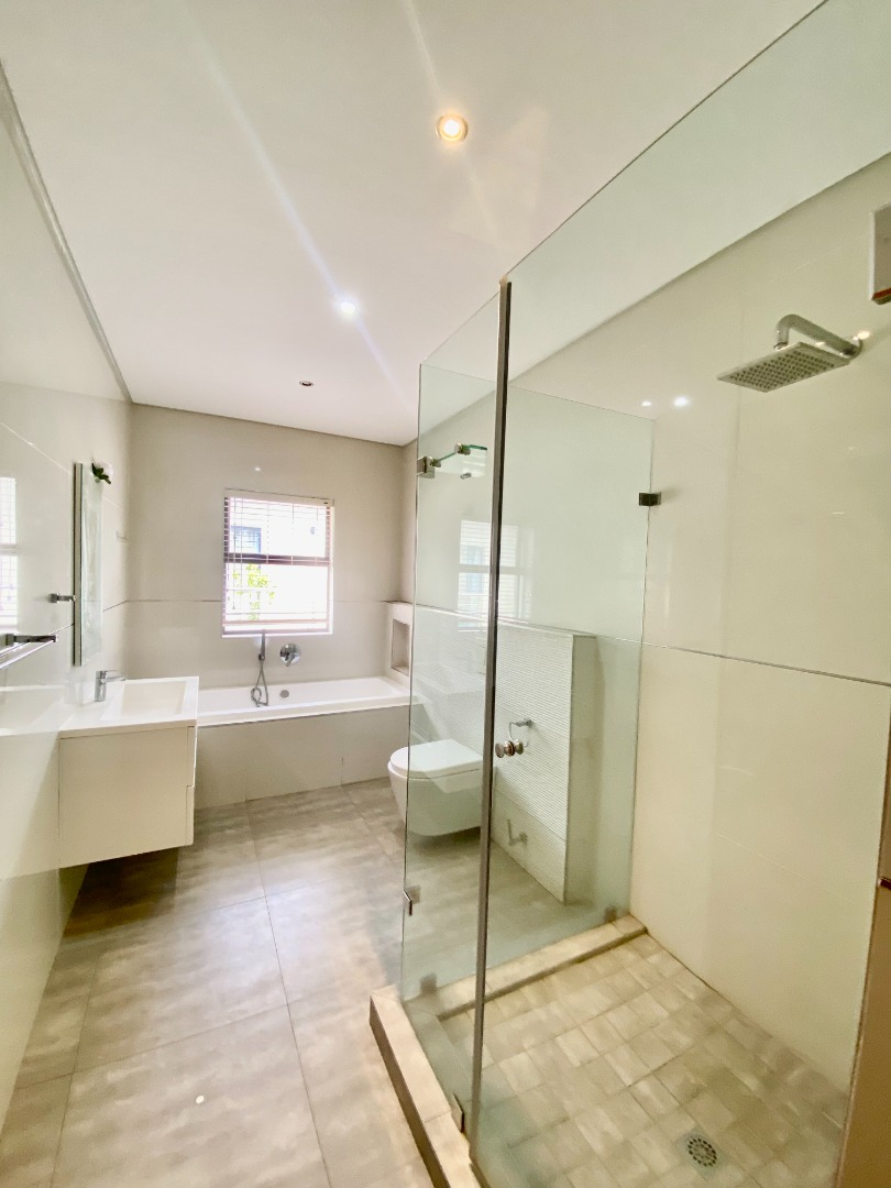The main bedroom is a true sanctuary, featuring an expansive en-suite bathroom complete with a large bathtub, spacious shower, his-and-hers basins, and a toilet. Elegant finishes, beautiful floors, and designer wallpaper create a tranquil retreat. The room opens onto a private balcony overlooking the pool and garden area an ideal space for peaceful mornings or evening relaxation.