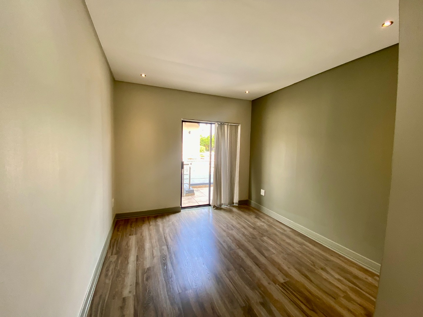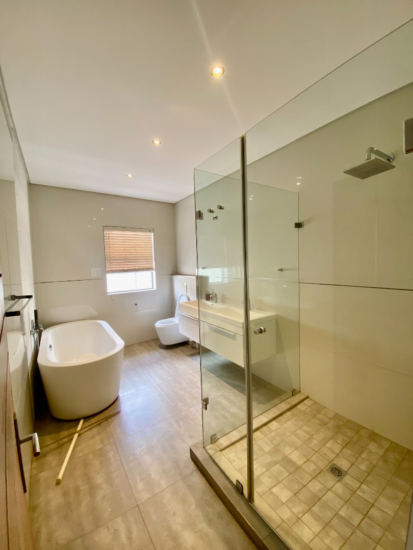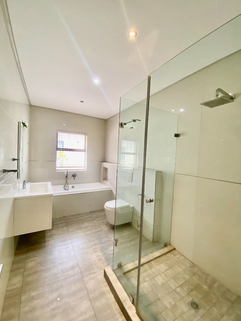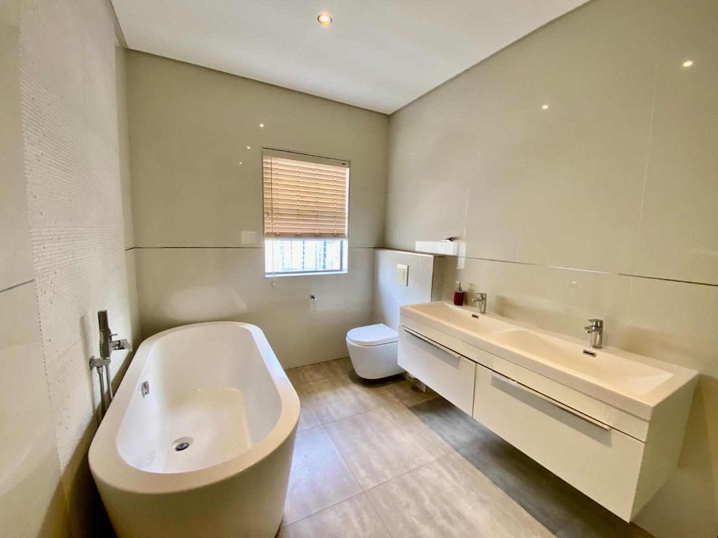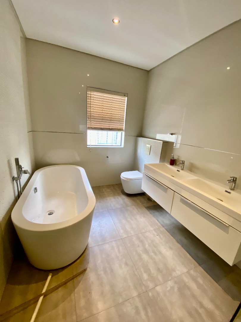 The main bedroom is a true sanctuary, featuring an expansive en-suite bathroom complete with a large bathtub, spacious shower, his-and-hers basins, and a toilet. Elegant finishes, beautiful floors, and designer wallpaper create a tranquil retreat. The room opens onto a private balcony overlooking the pool and garden area an ideal space for peaceful mornings or evening relaxation.