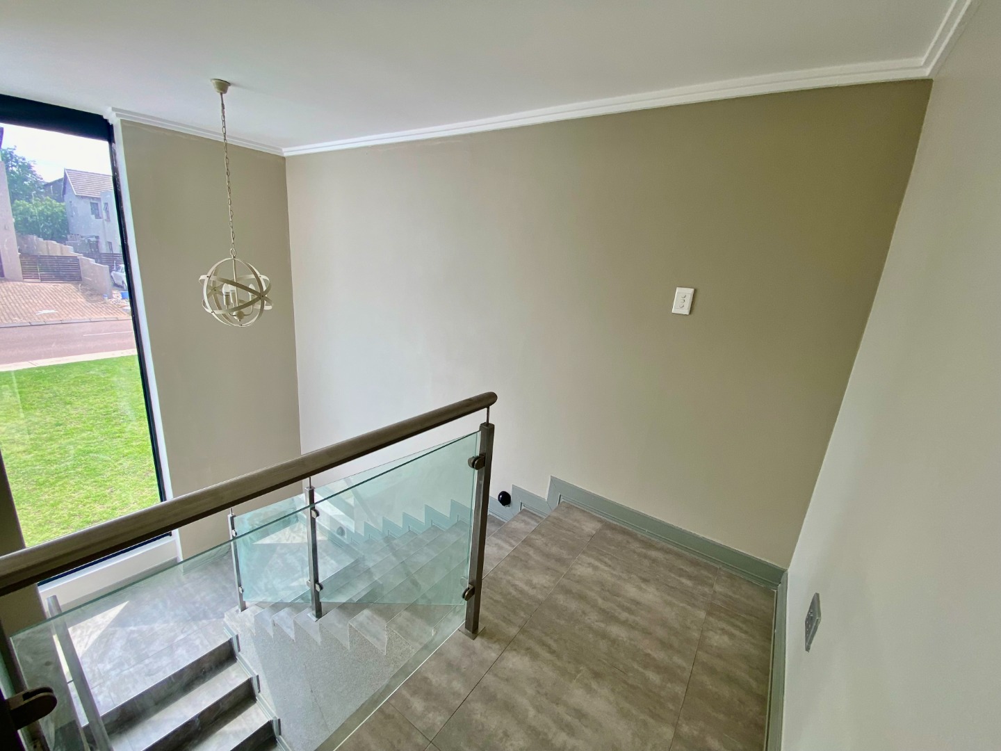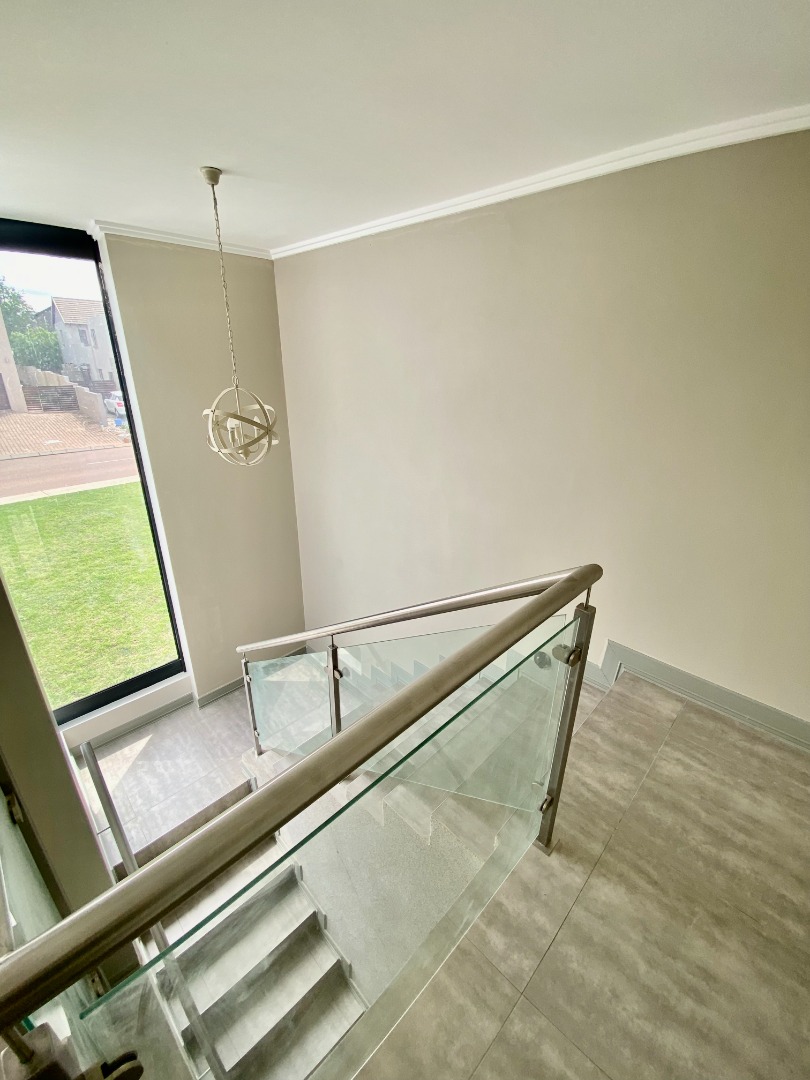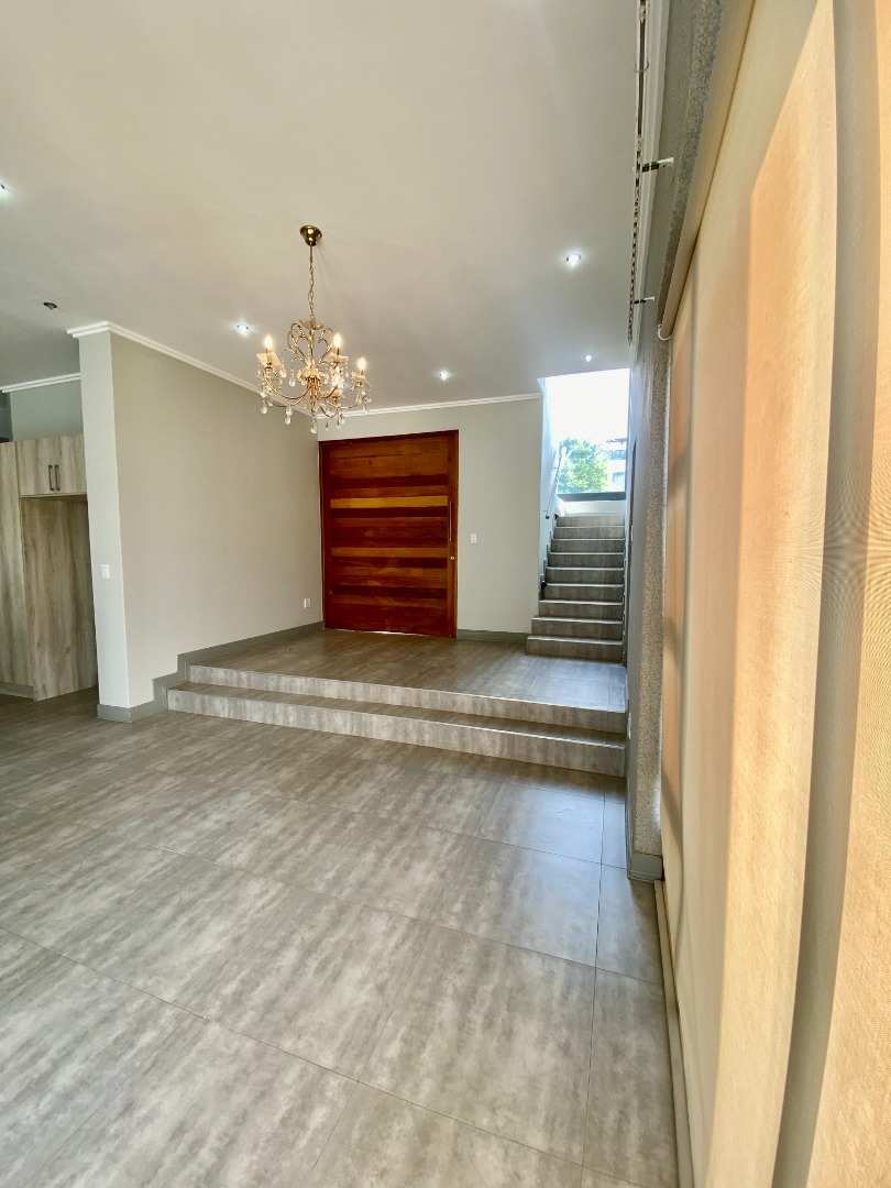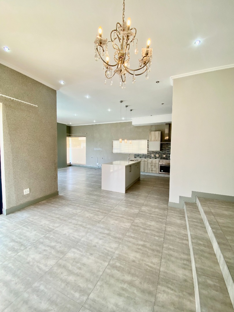 A modern staircase leads you to the upper level, highlighted by a magnificent chandelier that hangs gracefully over the double-volume living area. Large glass windows flood the home with natural light, showcasing the elegance and spaciousness of this double-story masterpiece. Every angle reveals the thoughtful design that defines this property.