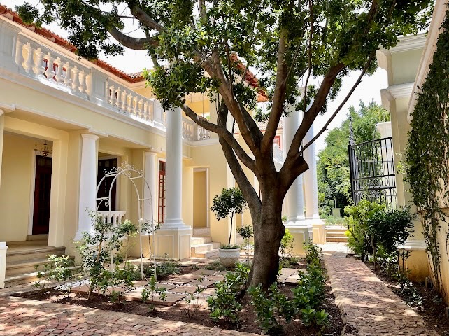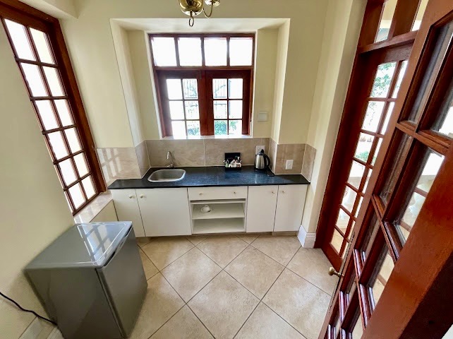 The kitchenette is well-appointed and also opens onto the patio, and comes equipped with an induction plate and refrigerator, offering both convenience and functionality.