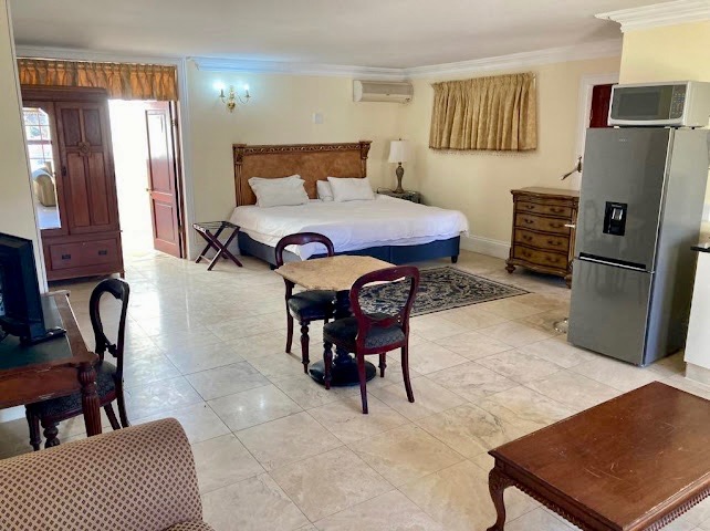 The space features a spacious open-plan layout with elegant finishes, creating a warm and inviting atmosphere. The bedroom area is tastefully furnished, complemented by classic décor and ample natural light. A modern kitchenette is equipped with an induction plate, refrigerator, and essential fittings—ideal for convenient, everyday living.