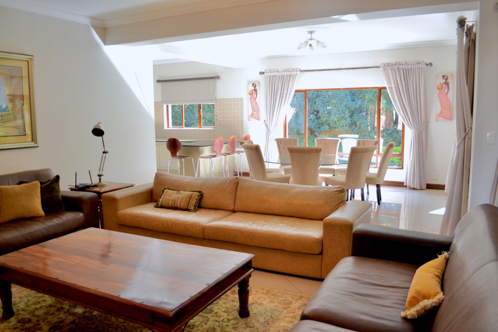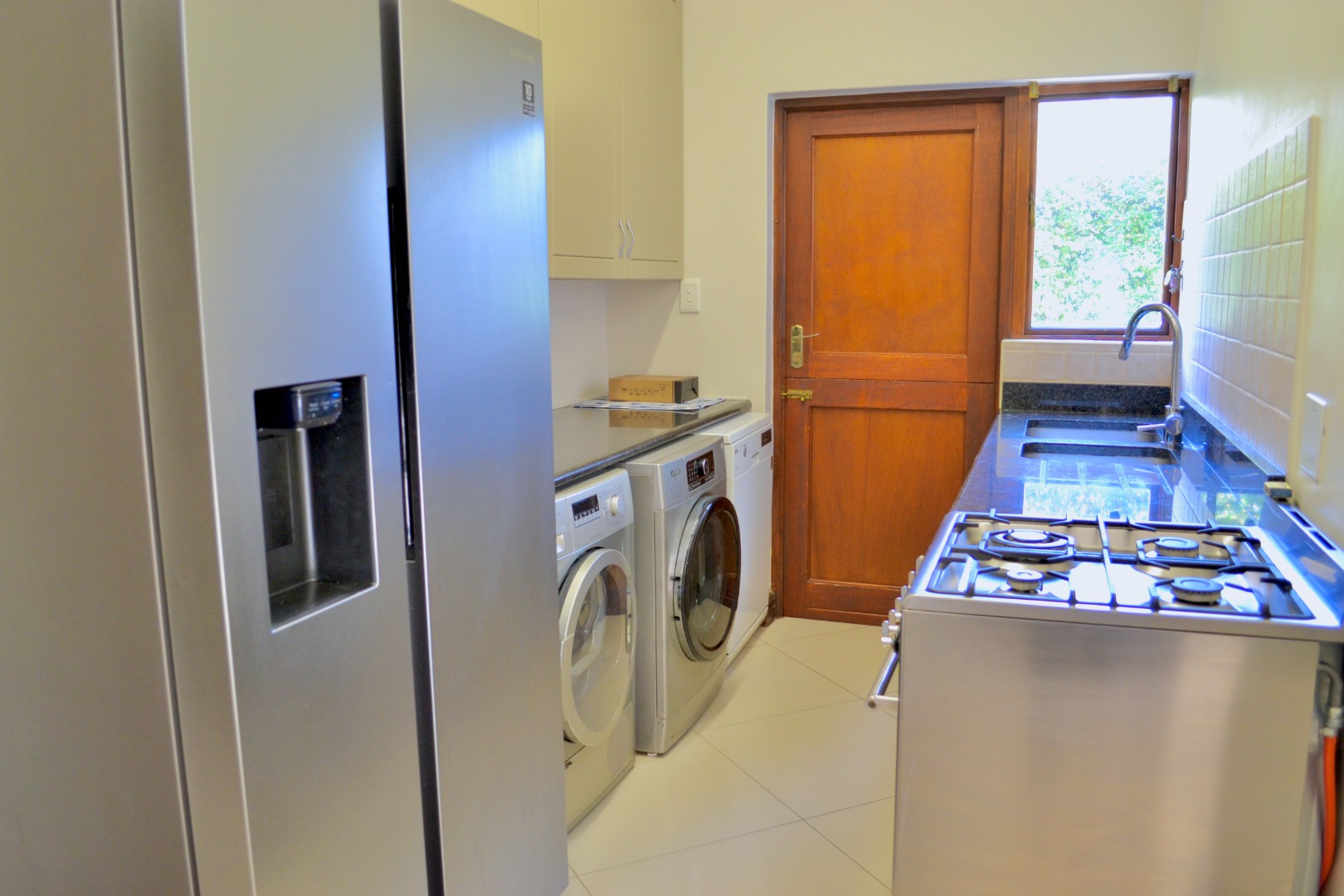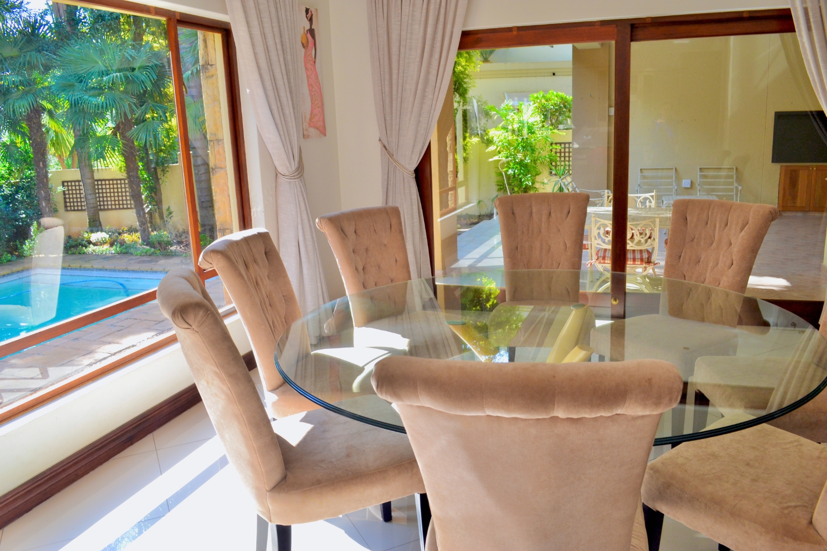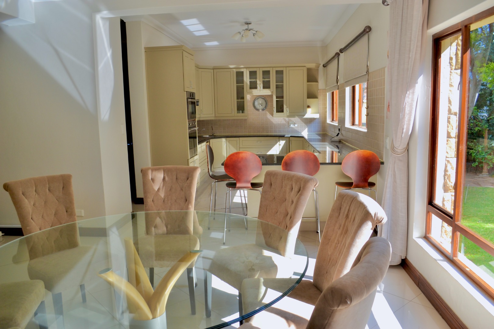 The heart of the home features an open-plan living and dining area that seamlessly flows onto the patio with a built-in braai, overlooking the lush garden and sparkling pool. The kitchen is a chef's dream, equipped with granite countertops, an electric oven and hob, and a scullery complete with all appliances, a gas stove top, and a pantry. The house is elegantly tiled throughout, except for the bedrooms and the two adaptable rooms downstairs.