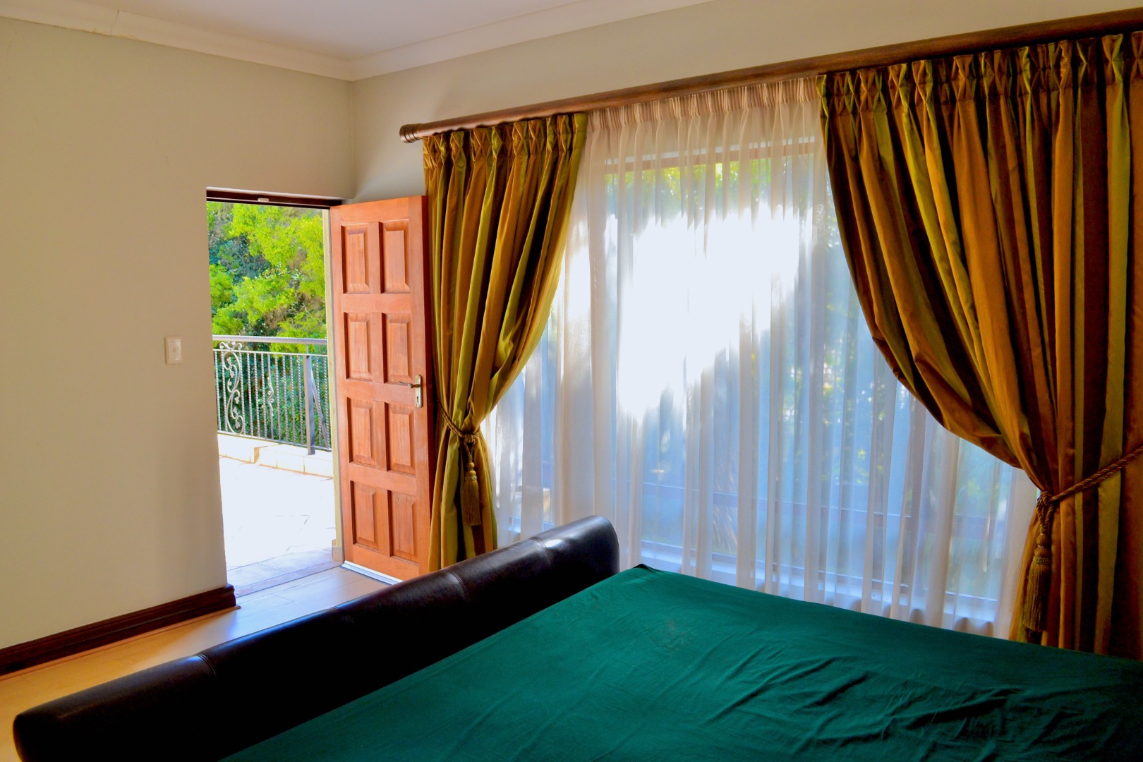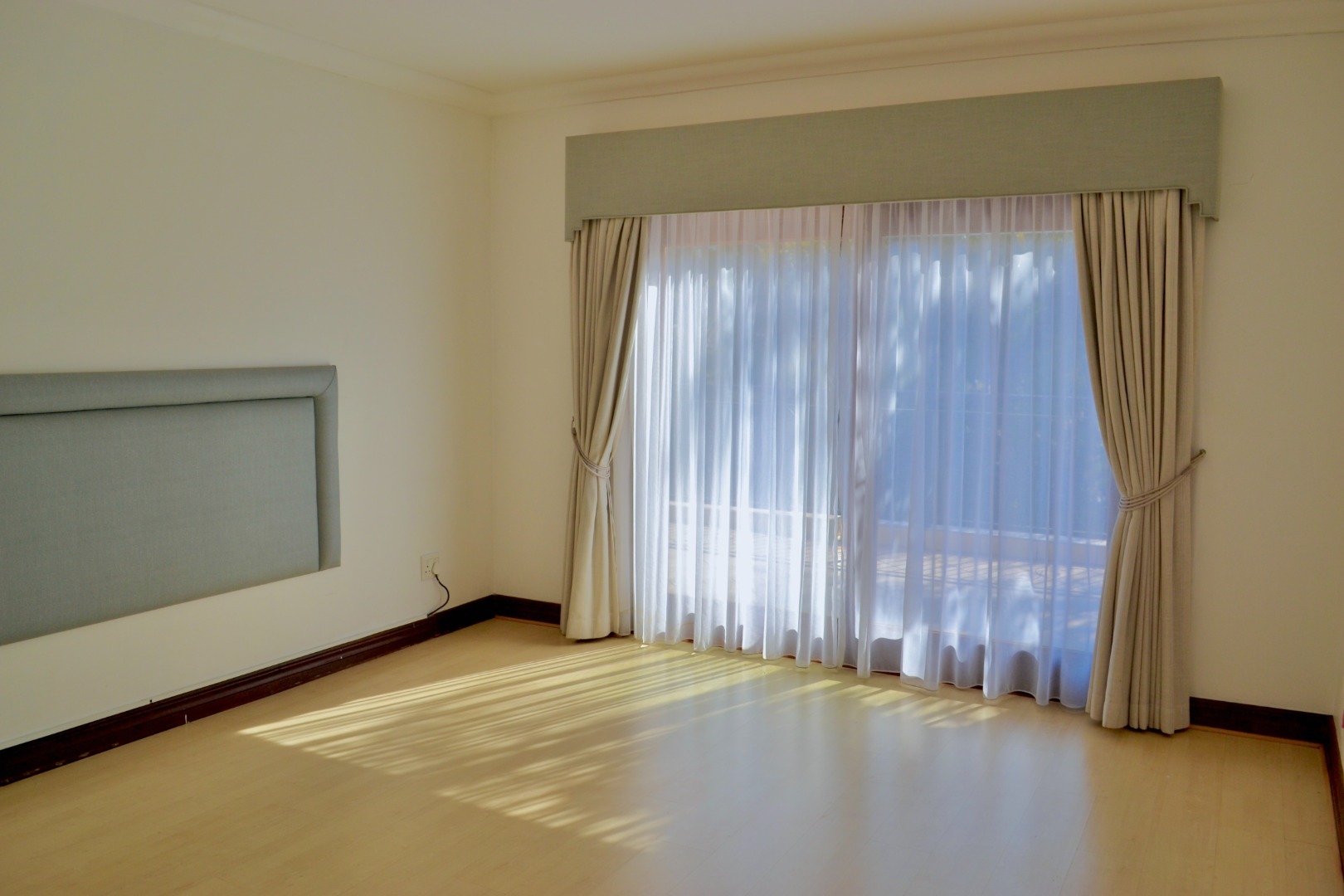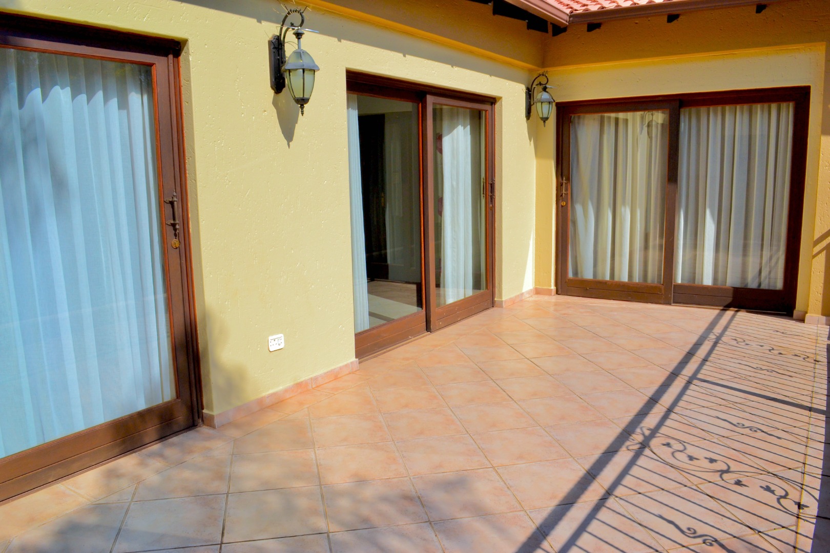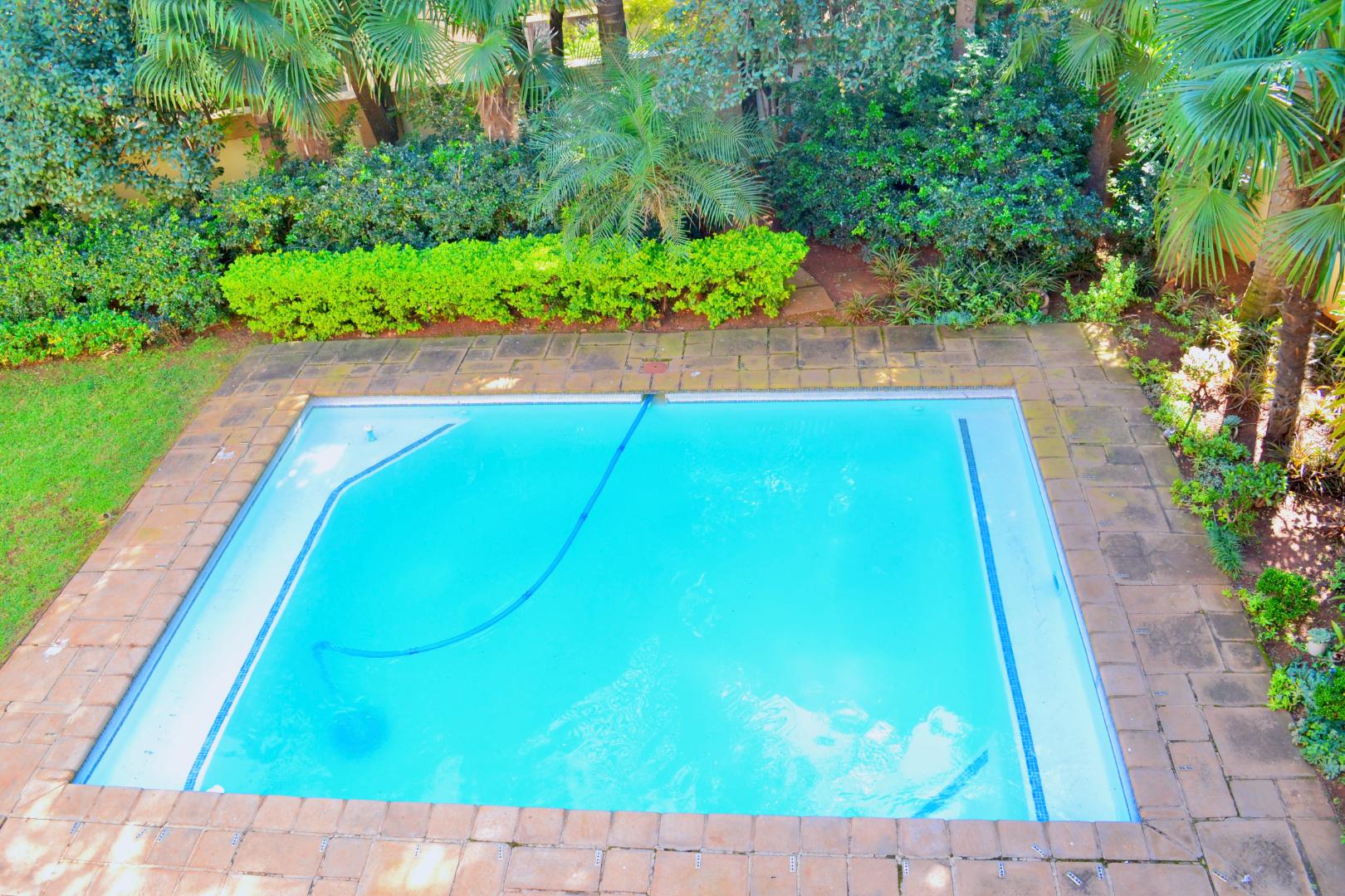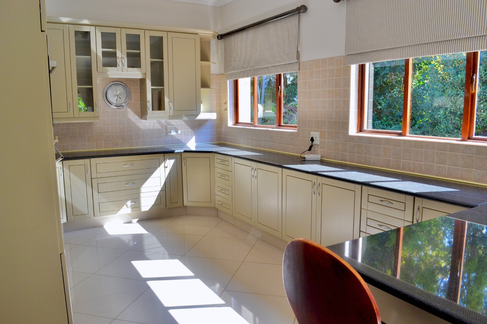 The heart of the home features an open-plan living and dining area that seamlessly flows onto the patio with a built-in braai, overlooking the lush garden and sparkling pool. The kitchen is a chef's dream, equipped with granite countertops, an electric oven and hob, and a scullery complete with all appliances, a gas stove top, and a pantry. The house is elegantly tiled throughout, except for the bedrooms and the two adaptable rooms downstairs.