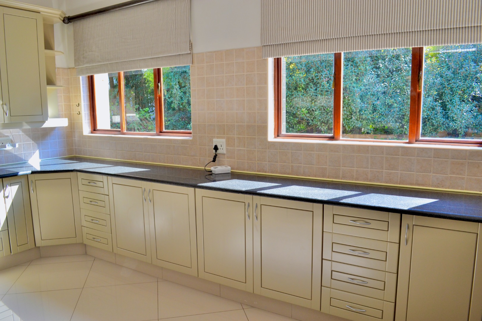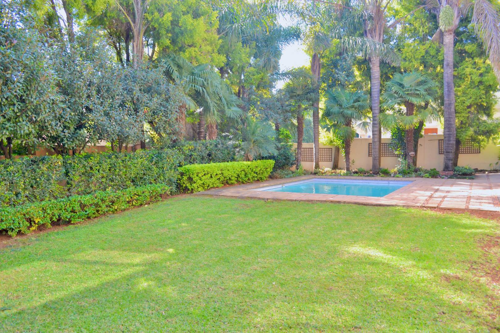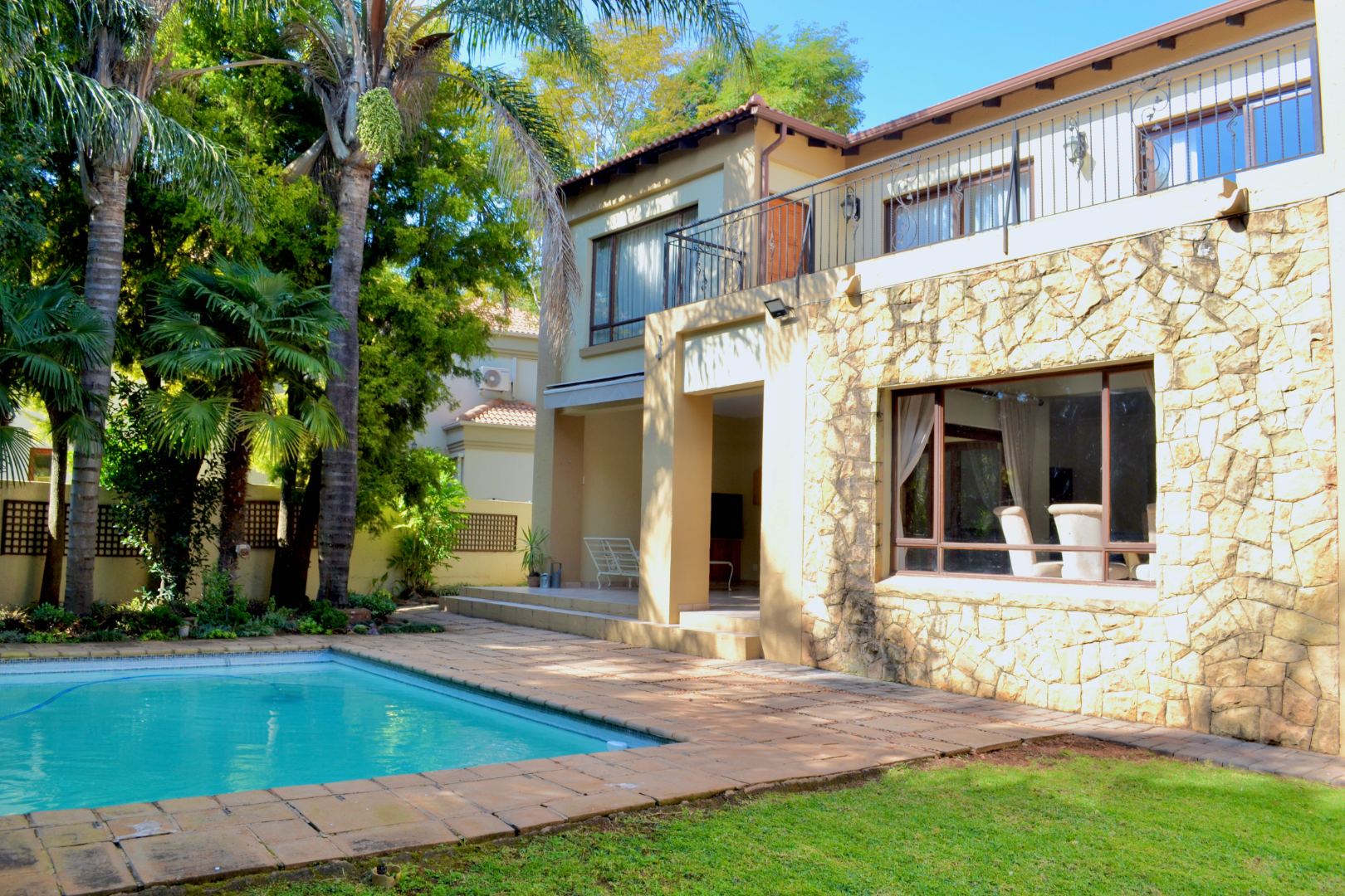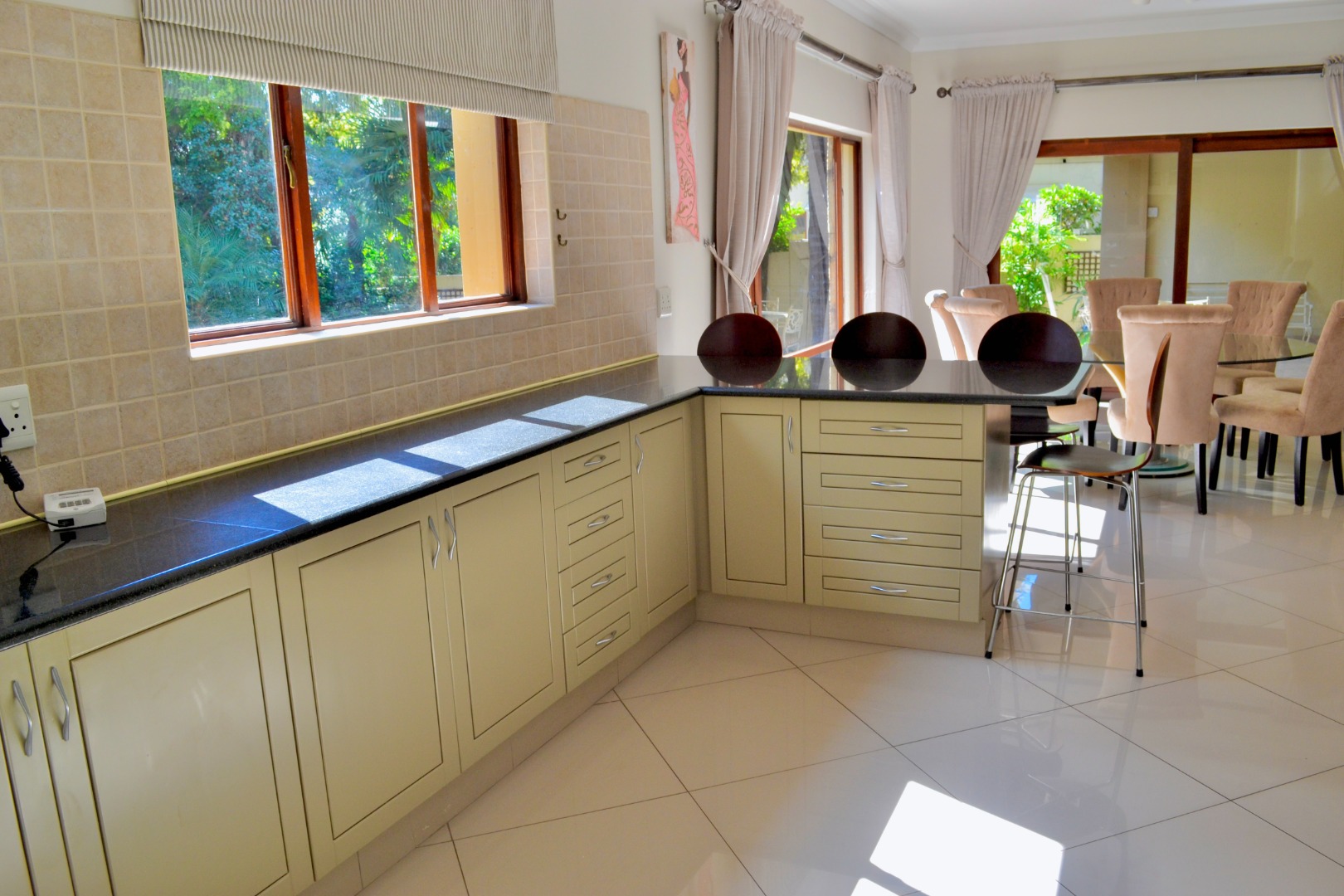 The heart of the home features an open-plan living and dining area that seamlessly flows onto the patio with a built-in braai, overlooking the lush garden and sparkling pool. The kitchen is a chef's dream, equipped with granite countertops, an electric oven and hob, and a scullery complete with all appliances, a gas stove top, and a pantry. The house is elegantly tiled throughout, except for the bedrooms and the two adaptable rooms downstairs.