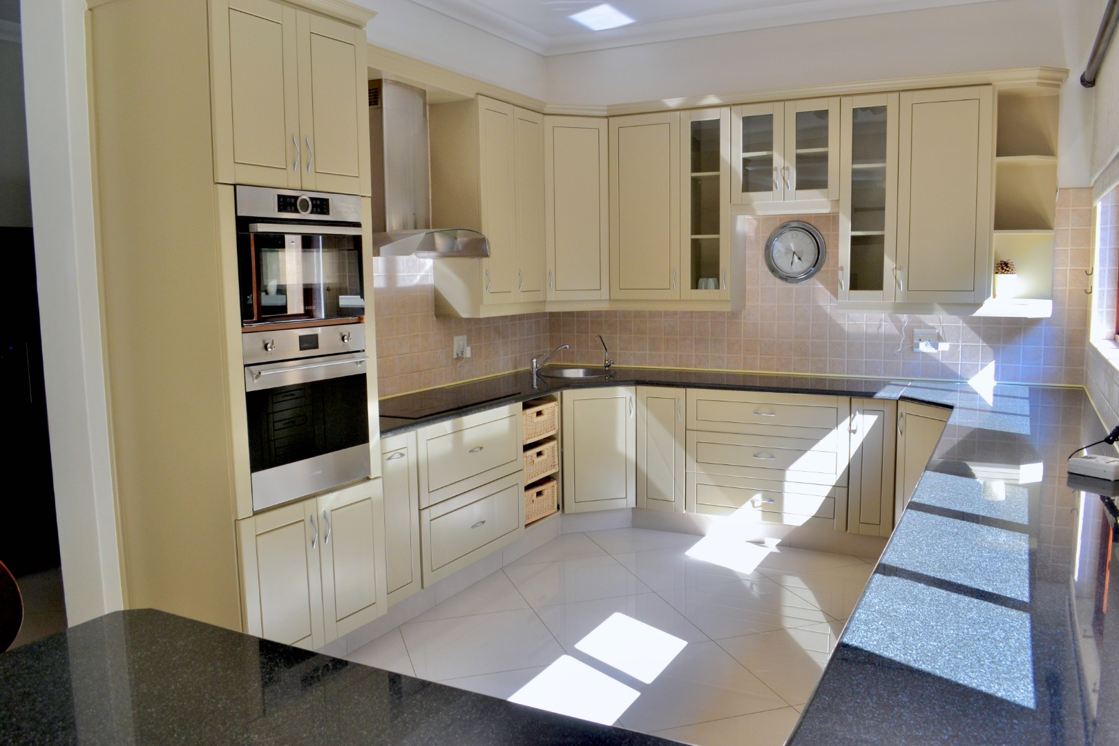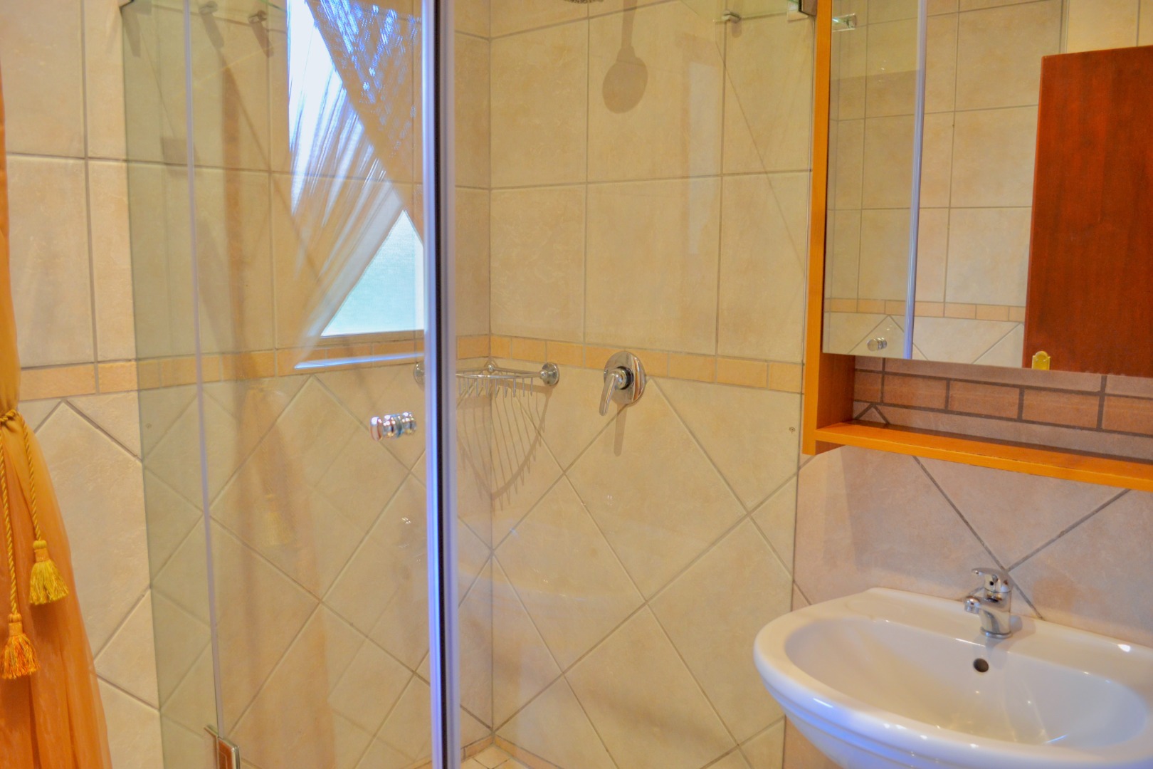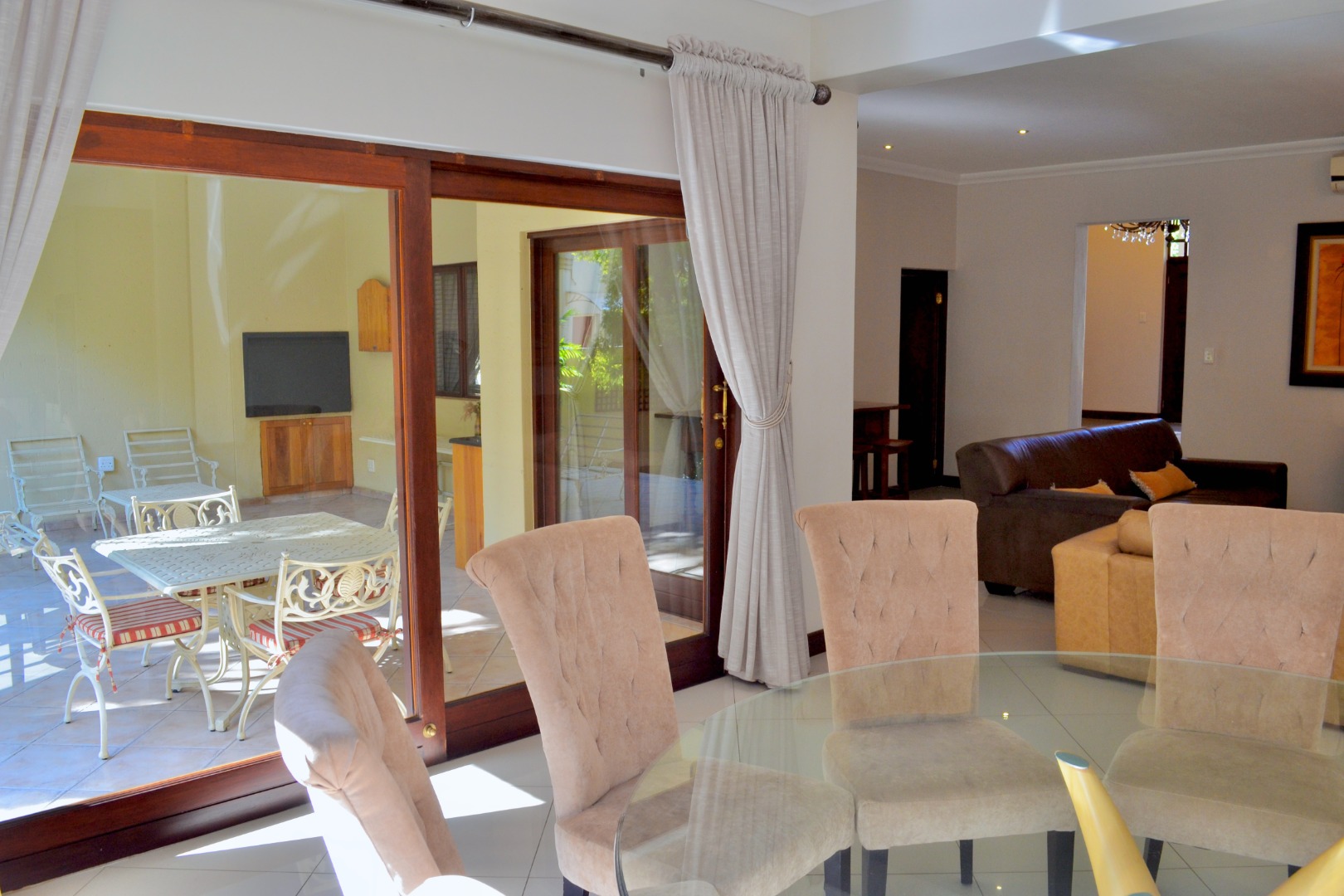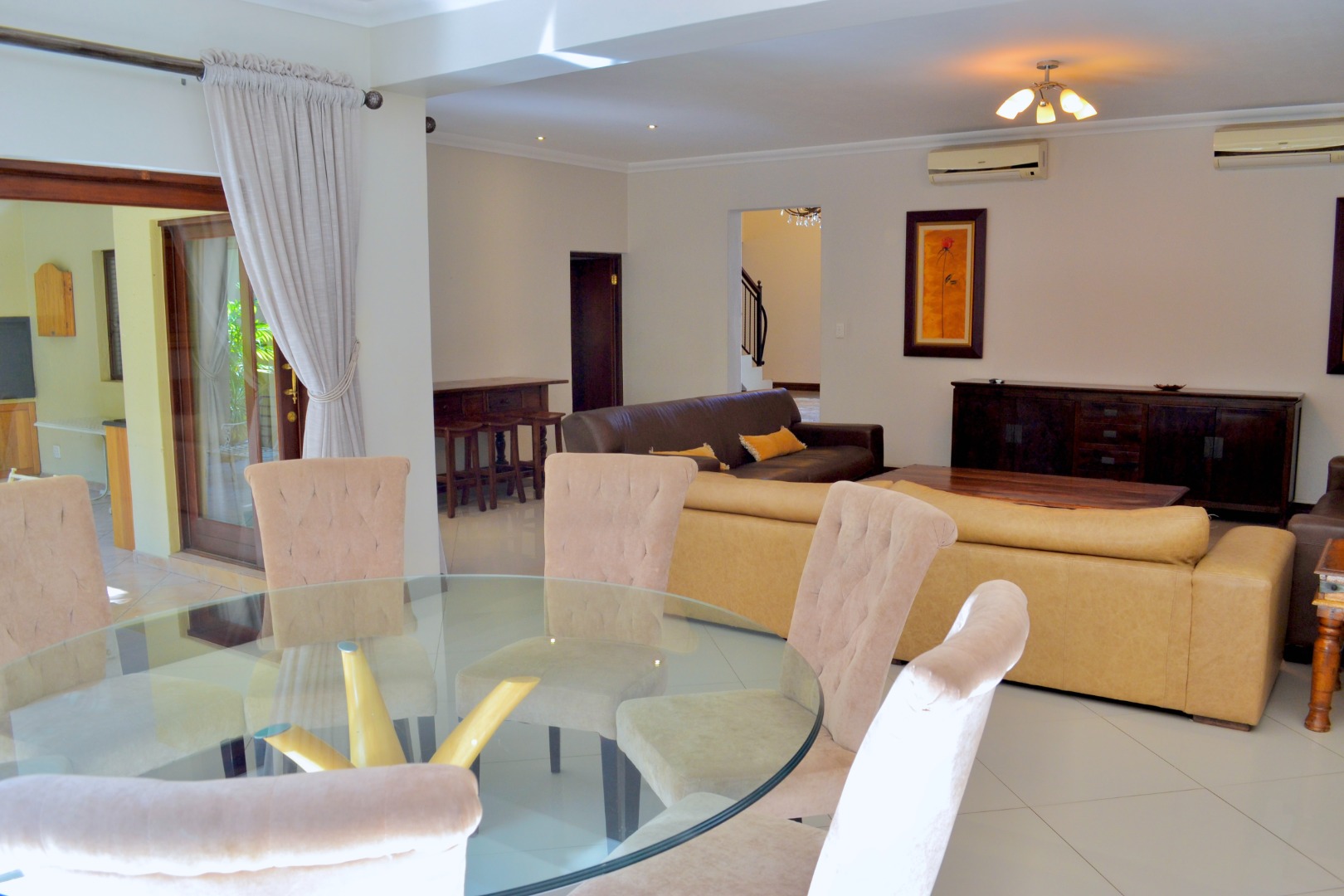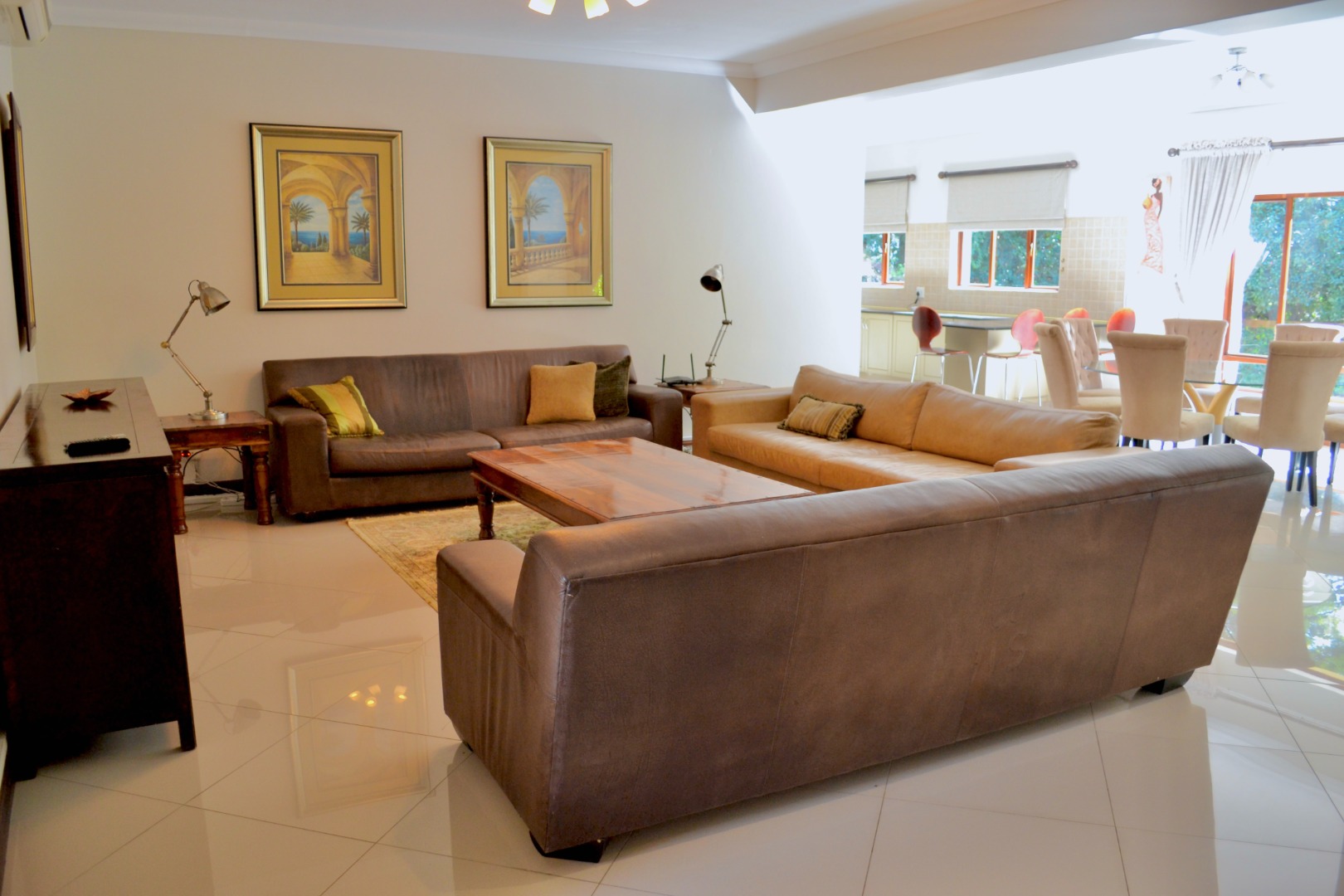 The heart of the home features an open-plan living and dining area that seamlessly flows onto the patio with a built-in braai, overlooking the lush garden and sparkling pool. The kitchen is a chef's dream, equipped with granite countertops, an electric oven and hob, and a scullery complete with all appliances, a gas stove top, and a pantry. The house is elegantly tiled throughout, except for the bedrooms and the two adaptable rooms downstairs.