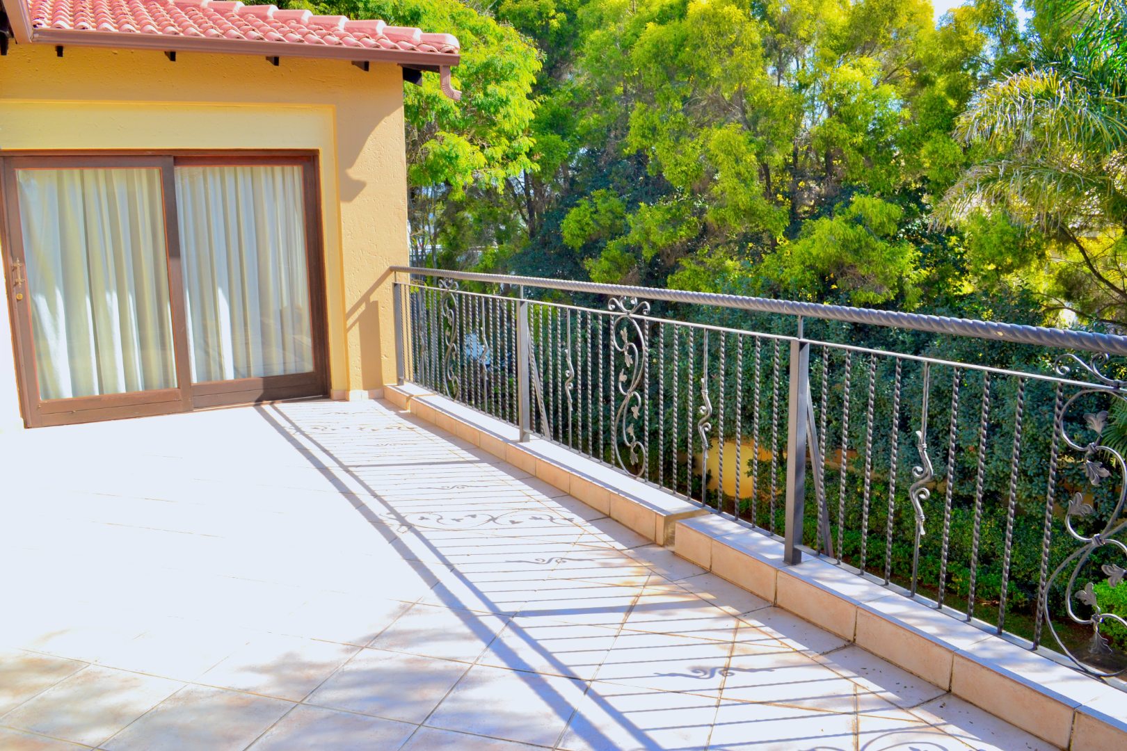 Upstairs, you'll find a bedroom with an ensuite bathroom that opens onto a charming balcony. Two additional bedrooms share a well-appointed bathroom. The expansive main bedroom offers a private lounge area for relaxation and features an ensuite bathroom with walk-in closets and doors leading to the balcony. An air conditioning unit ensures comfort year-round.