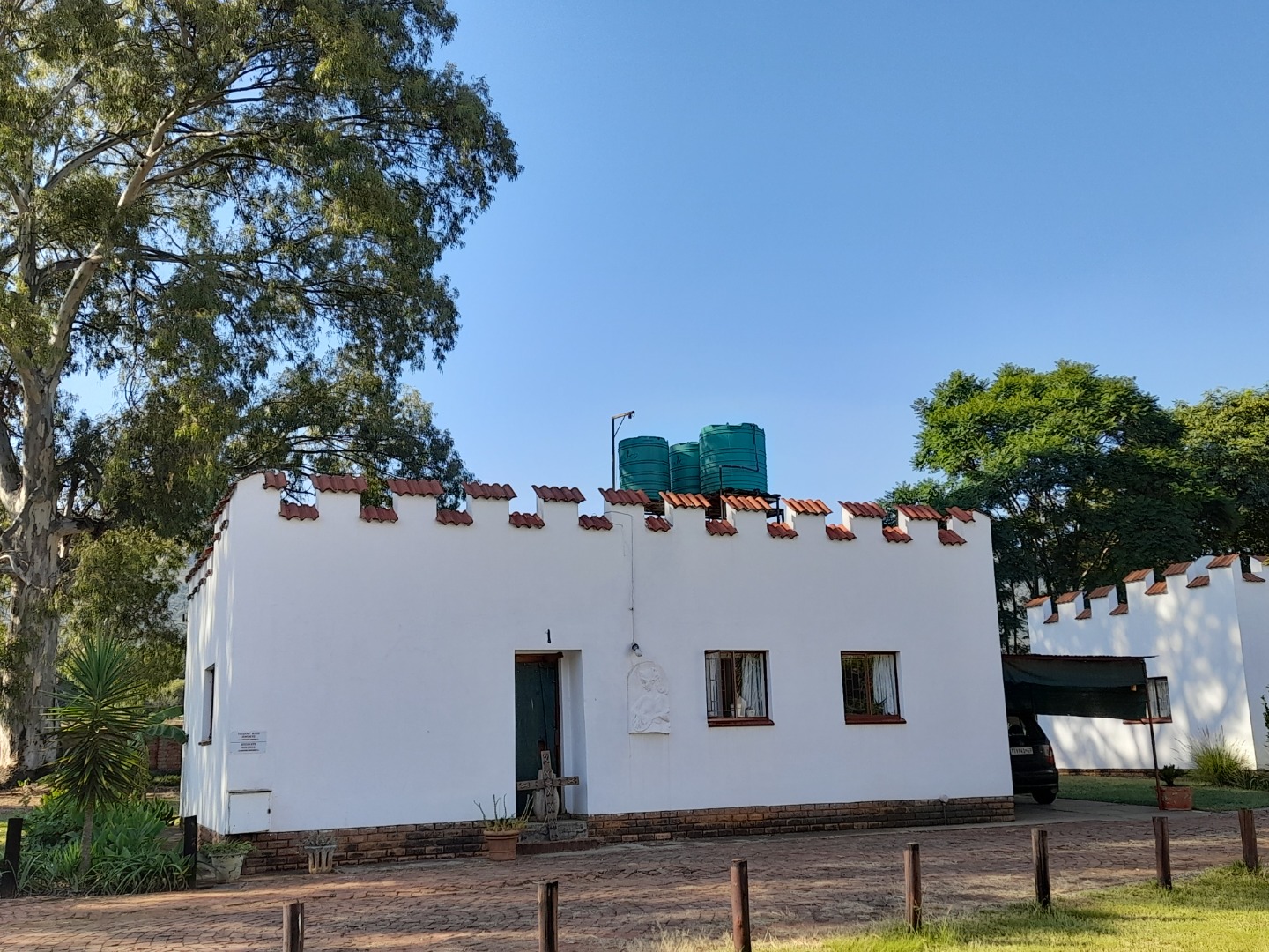 Security is addressed with visible window bars, contributing to peace of mind. Prominent water storage tanks on the roof highlight potential for enhanced water self-sufficiency, aligning with sustainable living practices. The property is situated within a holiday resort, offering a distinct community feel.