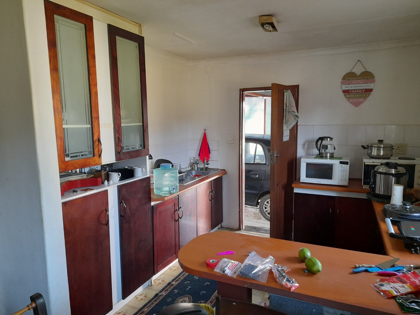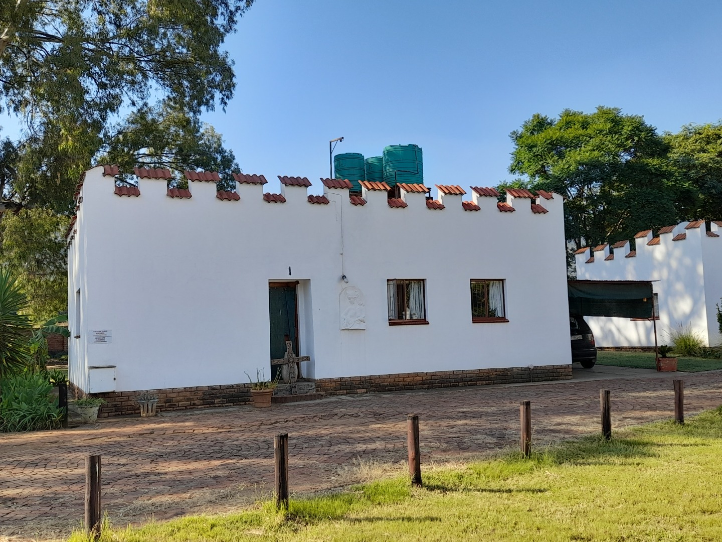 Security is addressed with visible window bars, contributing to peace of mind. Prominent water storage tanks on the roof highlight potential for enhanced water self-sufficiency, aligning with sustainable living practices. The property is situated within a holiday resort, offering a distinct community feel.